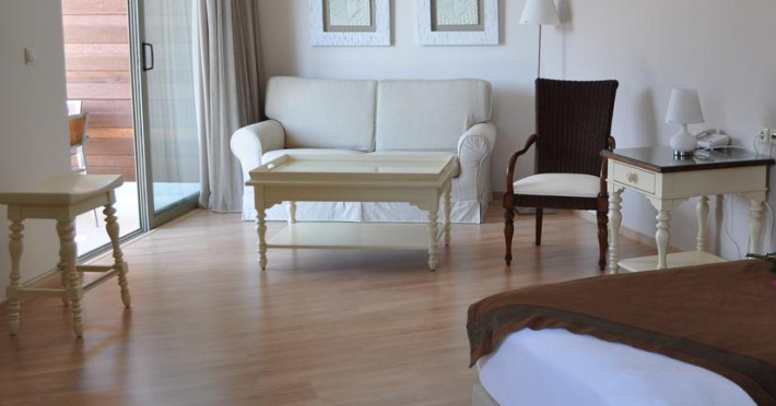 Unele camere au balcon cu vedere la mare, unde oaspeții pot admira apusul sau răsăritul soarelui. Camerele de la San Nicolas Resort sunt dotate cu aer condiționat, Tv cu canale prin satelit și seif. În camere există baie cu cadă sau duș ce are în dotare foehn și articole de toaletă gratuite. Fiecare cameră dispune de minibar. Oaspeții pot solicita serviciul de room service pentru a servi masa sau diverse băuturi. Oaspeții au acces gratuit la serviciul Wi-fi în camere. Curățenia in cameră se face zilnic. Proprietatea oferă camere pentru familie cu o suprafață mai mare și un număr mai mare de paturi față de cele standard.