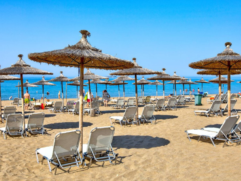 Plaja lata, cu nisip fin si intrare lina in mare.