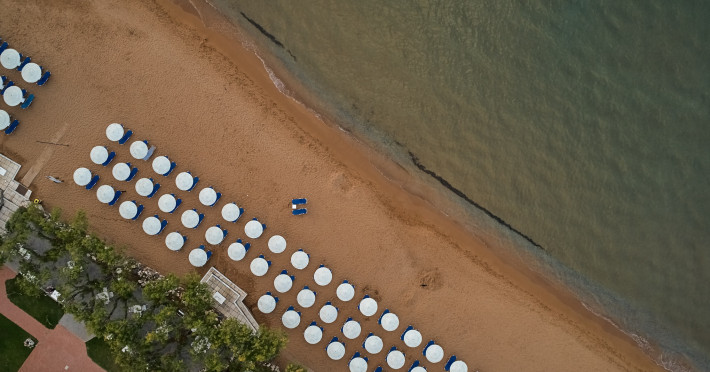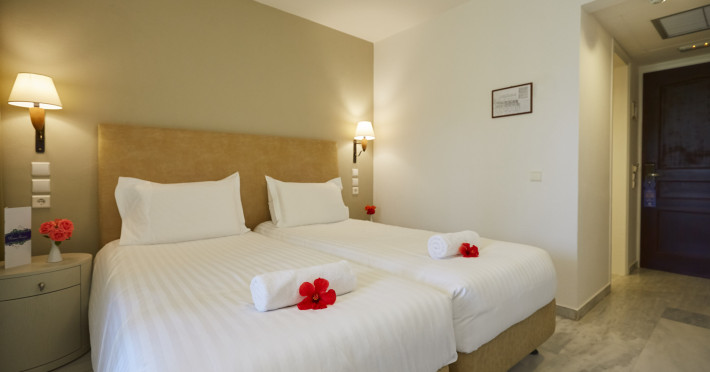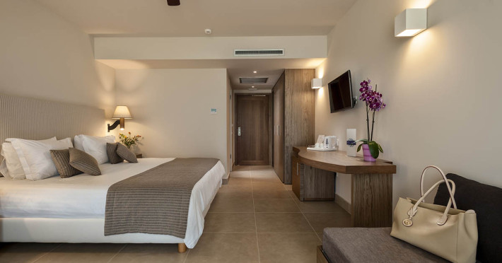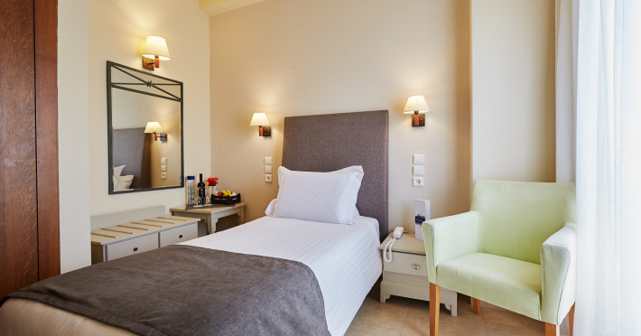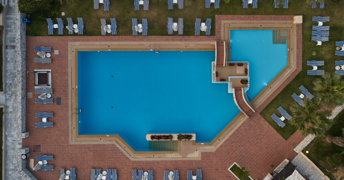The hotel is separated by the old national road into three structures and connected via an underground tunnel, the beach complex, the pool complex and the ‘Pearl Wing’ with a combined total of 212 accommodation units. All accommodation units at Santa Marina Beach Hotel have a view either to the garden, pool or to the sea. These are well designed, finely decorated with modern touches, refreshing colors and comfortable furnishings.