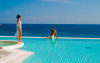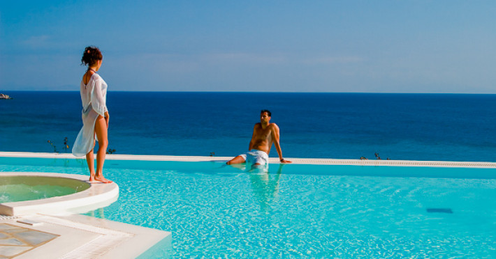 Fiecare camera si apartament ofera vederi panoramice spre marea Egee si spre insulele din jur. Hotelul ofera cazare in 96 de camere si apartamente, impartite dupa cum urmeaza in: camere duble standard, superioare, deluxe, junior suite, deluxe suite, maisonette, deluxe suite cu piscina privata. Toate camerele au in dotare: aer conditionat, TV satelit, telefon, mini bar, seif, feon, papuci si halate de baie, cosmetice de baie, terasa cu vedere spre mare, baby cot (la cerere, gratuit) si grup sanitar propriu.