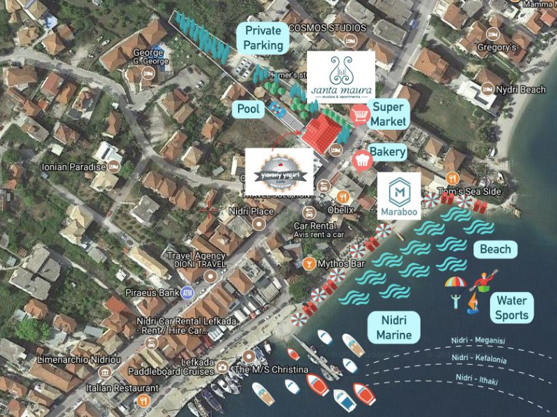 Studios and apartments.Just 50 m from the pebbled Nydri Beach, Santa Maura offers air-conditioned, self-catered accommodation. Studios feature balconies overlooking the pool or Mount Elati or hotel gardens. Drinks and frozen yoghurt are served at the on-site bar.Each studio at the Santa Maura includes a well-equipped kitchenette with fridge. Satellite LCD TV and free Wi-Fi access are offered in all units.Guests can relax at the sun terrace, by the pool. The in-house tour desk can provide helpful information to further explore the island of Lefkada.Studios and apartments.Just 50 m from the pebbled Nydri Beach, Santa Maura offers air-conditioned, self-catered accommodation. Studios feature balconies overlooking the pool or Mount Elati or hotel gardens. Drinks and frozen yoghurt are served at the on-site bar.Each studio at the Santa Maura includes a well-equipped kitchenette with fridge. Satellite LCD TV and free Wi-Fi access are offered in all units.Guests can relax at the sun terrace, by the pool. The in-house tour desk can provide helpful information to further explore the island of Lefkada.