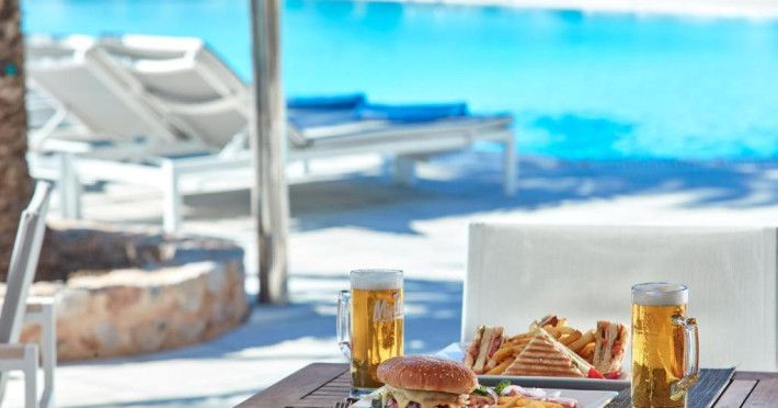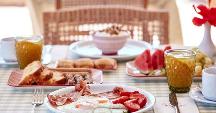 La Santo Miramare oaspeții au la dispoziție un restaurant care servește mâncare în stil bufet. Preparate din bucătăria grecească așteaptă să fie degustate în fiecare zi. Masa poate fi servită atât în interior, cît si în aer liber, pe terasă, în funcție de vreme. Oaspeţii pot avea diverse băuturi răcoritoare sau alcoolice la bar.