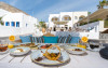 Oaspeții iși pot incepe ziua cu un mic dejun tip bufet, servit la barul proprietății, care oferă băuturi răcoritoare, cafea și gustări, pe tot parcursul zilei. Restaurantul oferă arome mediteraneene preparate cu produse locale insoțite de vinuri locale, pentru pranz sau cină.