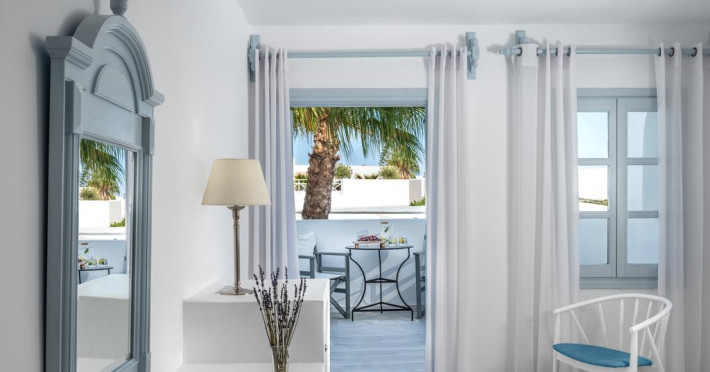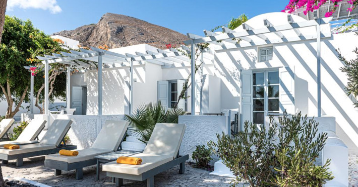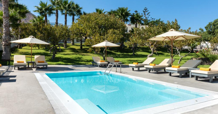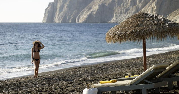 Santorini Kastelli Resort are în apropiere o plajă cu nisip. Pe plajă există șezlonguri și umbrele de plajă.