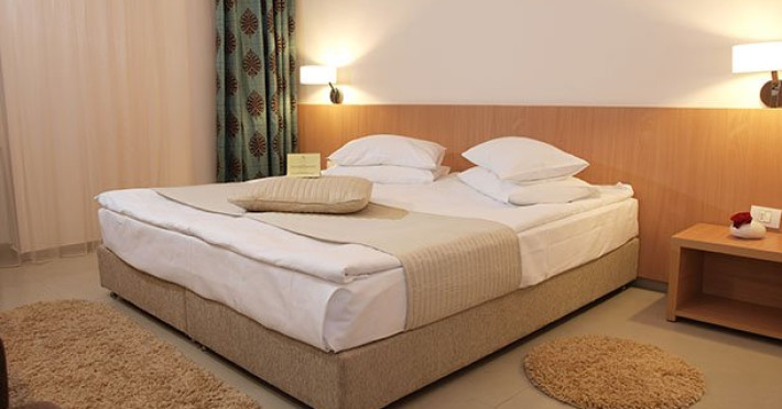 Camera dubla etaj: Camerele duble de la etaj, sunt repartizate pe 3 nivele, 26 au pat matrimonial, resul sunt dotate cu paturi twin. Toate camerele duble de la etaj au o terasa cu vedere spre lac, mare si gradina din jurul hotelului.