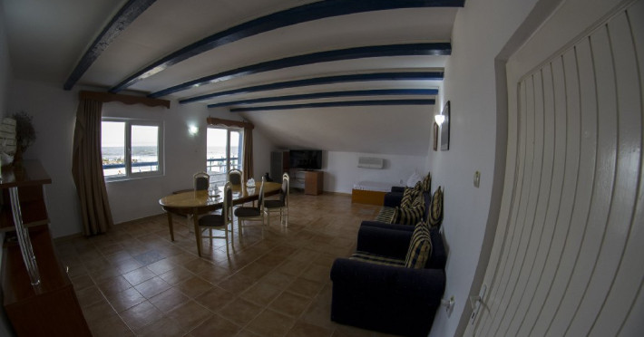 - APARTAMENT DELFINUL - Un apartament situat la etajul 2 al vilei Delfinul, cu vedere la mare, suprafata de aprox. 60 mp, compus din living spatios cu canapea extensibila, masa cu 10 scaune, fotolii si dormitor cu pat matrimonial, dotat cu: aer conditionat, LCD, minifrigider, internet wireless. Accesul in baie se face din dormitor. Terasa cu vedere la mare. Capacitate maxima 4 adulti.