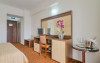 Camera de lux superioara matrimoniala, cu o suprafata de 26 mp, baie cu dus, terasa, pat matrimonial 180-180/200 cm, fotoliu extensibil, vedere la gradina, mobilier modern, decoratiuni marine, baie cu dus.