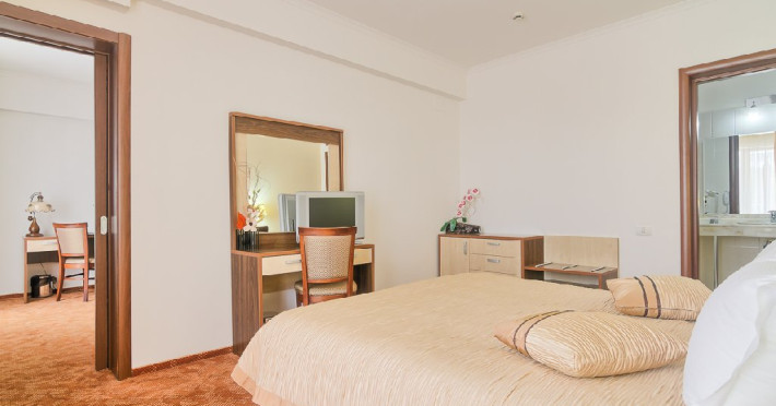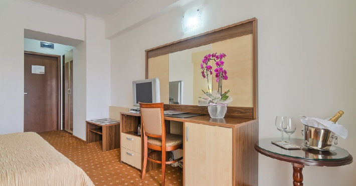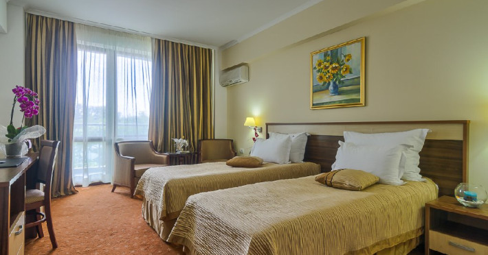 Camerele duble de lux standard- matrimoniala/twin, cu o suprafata de 26 mp, baie cu cada, balcon/terasa, pat matrimonial 160- 180/200 cm sau 2 paturi individuale 90/200 cm, doua fotolii