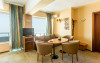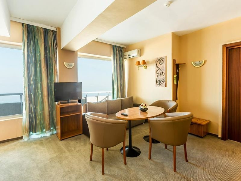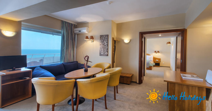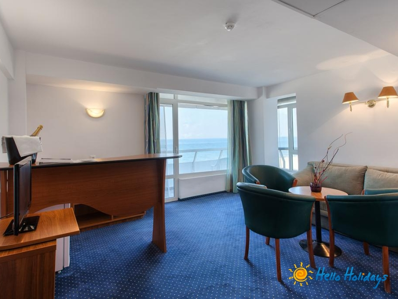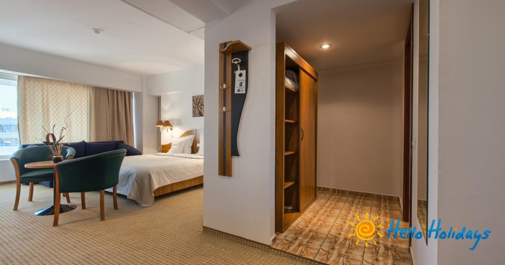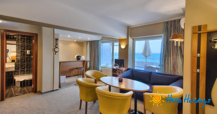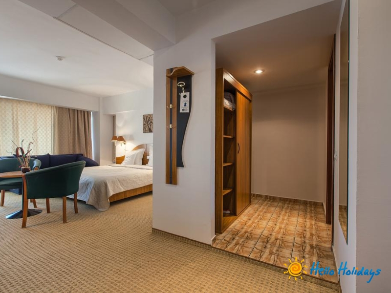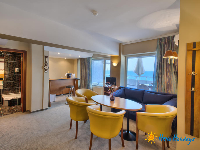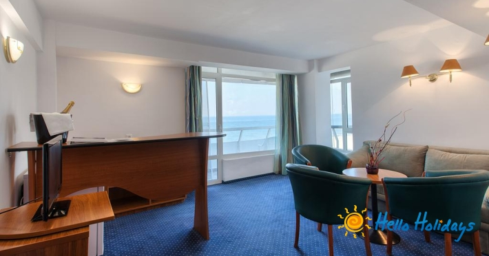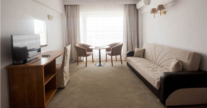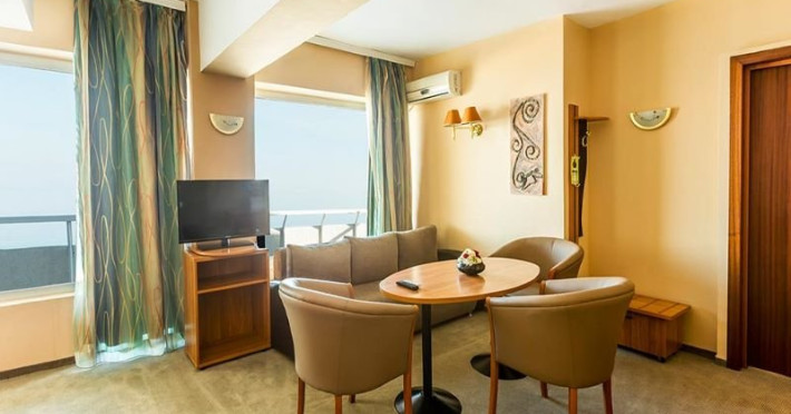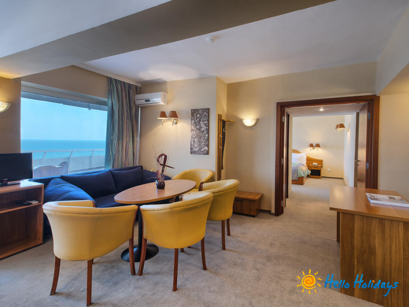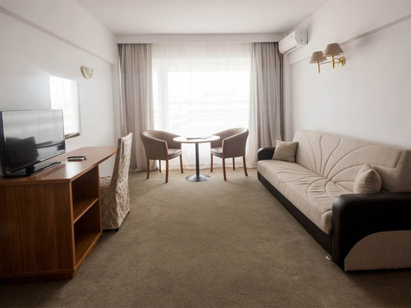 Apartament Junior: o alta categorie de spatii de cazare destinate familiilor este reprezentata de apartamentele Junior. Acestea sunt ideale pentru un sejur de poveste la mare, cu intreaga familie. Te vei putea bucura de un apartament spatios, elegant si aerisit, cu o suprafata de aproximativ 56 mp, ce include un balcon de 11 mp, dispus pe toata lungimea apartamentului, cu acces atat din dormitor, cat si din living.