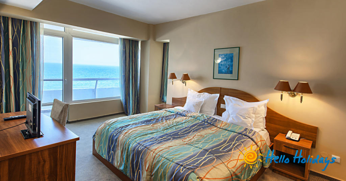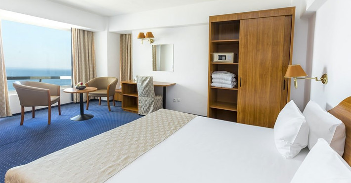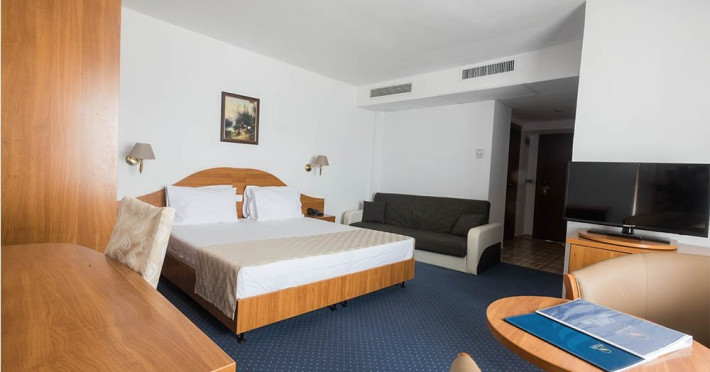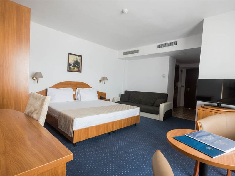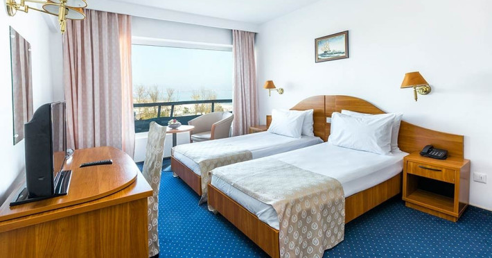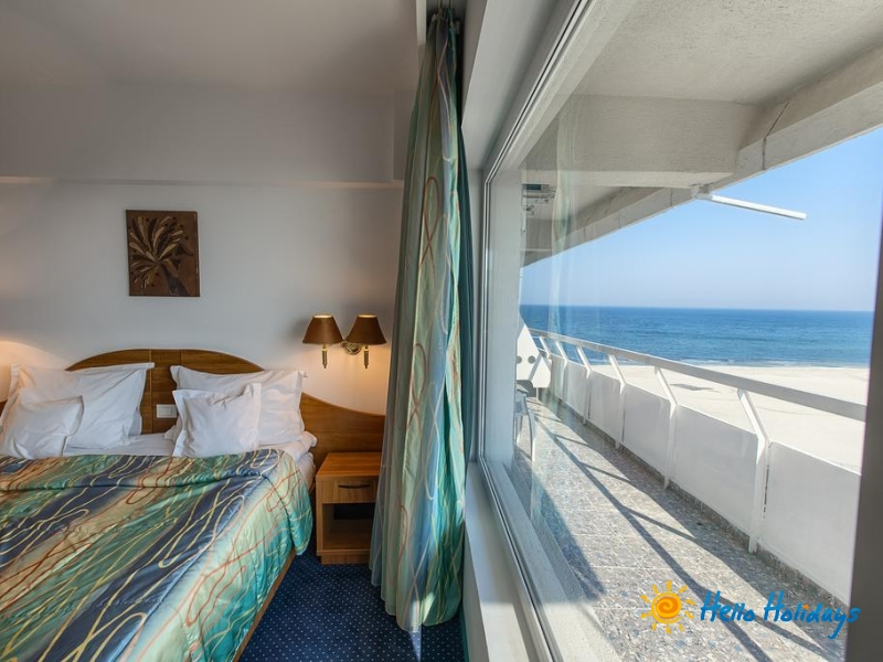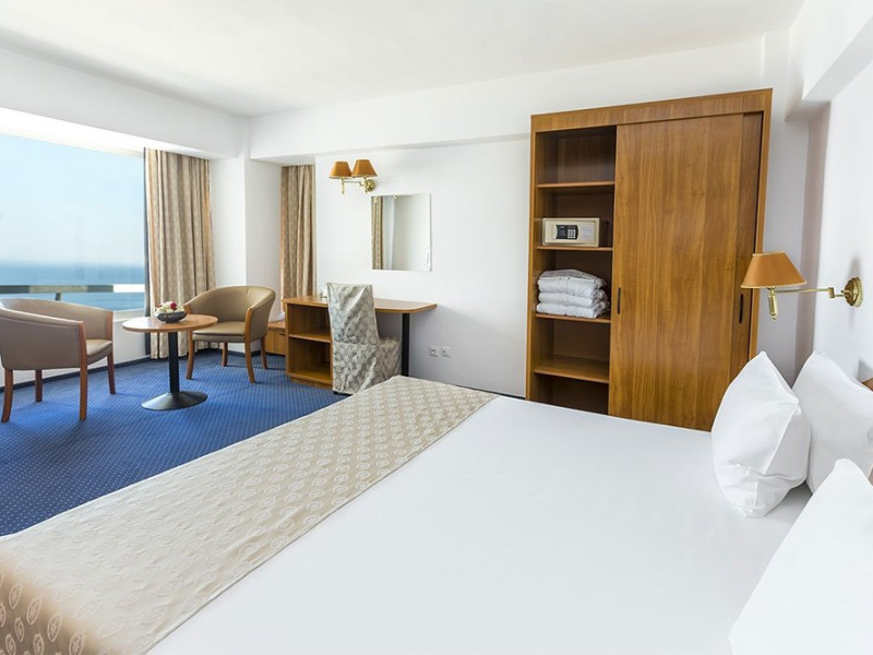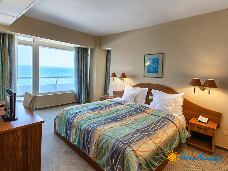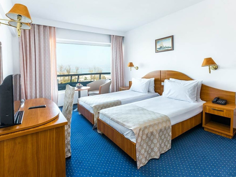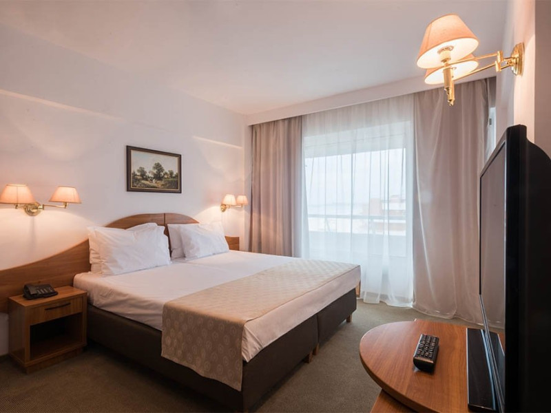 Camera dubla cu vedere la mare: daca ai visat la un sejur aproape de malul marii, unde briza sa-ti spuna la propriu Buna dimineata!, atunci camera dubla cu vedere la mare este alegerea ideala pentru un sejur de neuitat. Spatiul de aproximativ 30 mp ce include un balcon de 5 mp cu deschidere spre mare, este locul perfect pentru a te bucura de relaxare si confort.