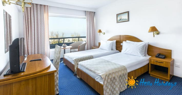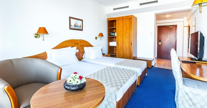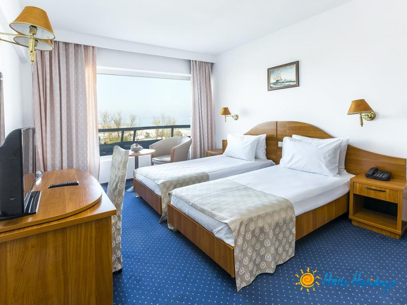 Camera dubla twin: are o suprafata generoasa de aproximativ 30 mp, ce include un balcon de 5 mp cu deschidere spre mare si lac, are doua paturi separate si un design primitor, asigurandu-ti confortul de care ai nevoie intr-o vacanta, atat pentru odihna cat si pentru activitatile tale obisnuite. Hotelul dispune de 42 de astfel de camere duble, destinate cazarii a cel mult 2 adulti si 2 copii cu varsta intre 0 - 11.99 ani sau 2 adulti si 1 copil cu varsta intre 12 - 15.99 ani.