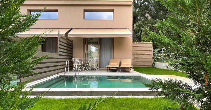 Enjoy luxurious rooms and suites with a private pool, close to the blue flag awarded, crystal clear and sandy beach of Valtos.
