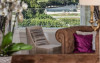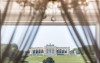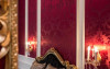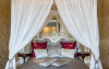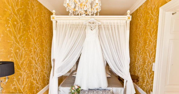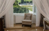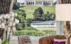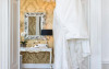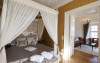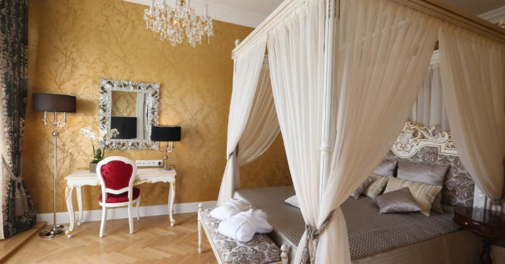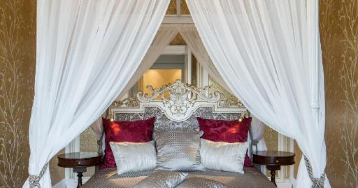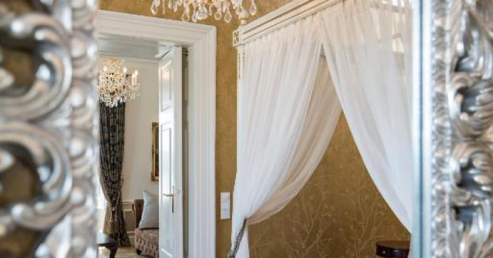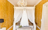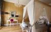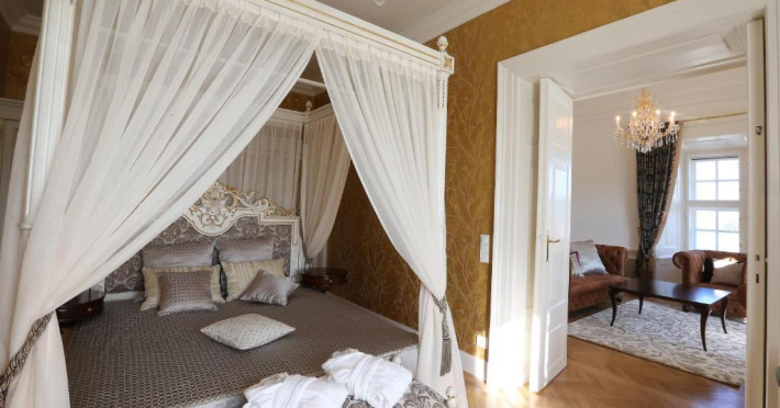 Dormitorul principal are pat cu baldachin și oferă vedere la clădirea Gloriette și la grădinile palatului.