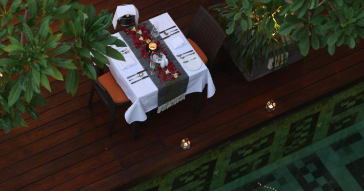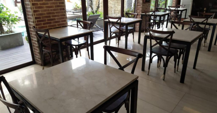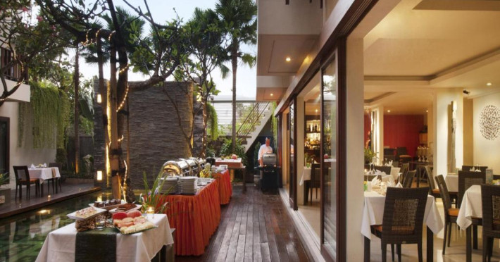Restaurantul serveste o selectie de preparate indoneziene si vestice, iar barul propune o varietate de băuturi.
