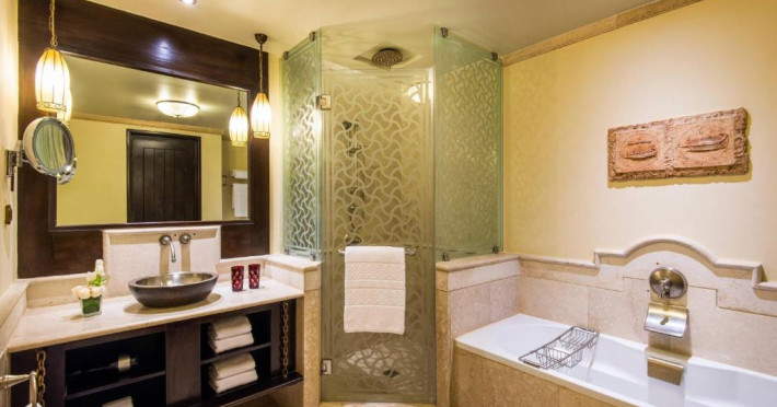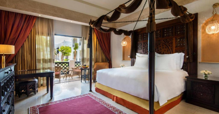 Camerele de la Sharq Village au decor oriental, ornamente din lemn și pat cu baldachin. Acestea oferă balcon privat cu vedere la satul-complex sau la golful Doha. Baia cu marmură include cadă adancă și duș cu efect de ploaie.