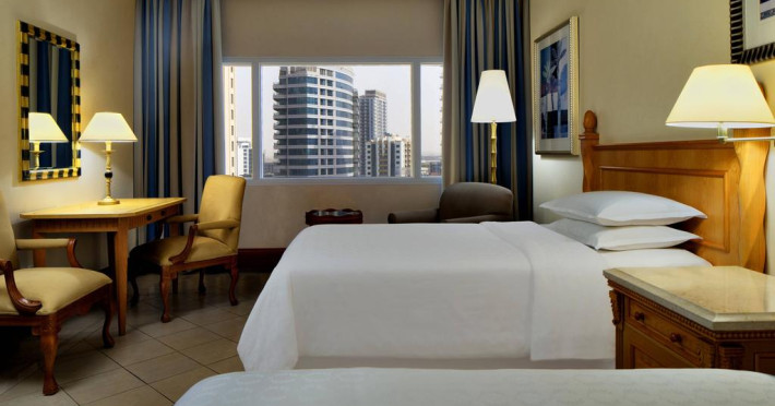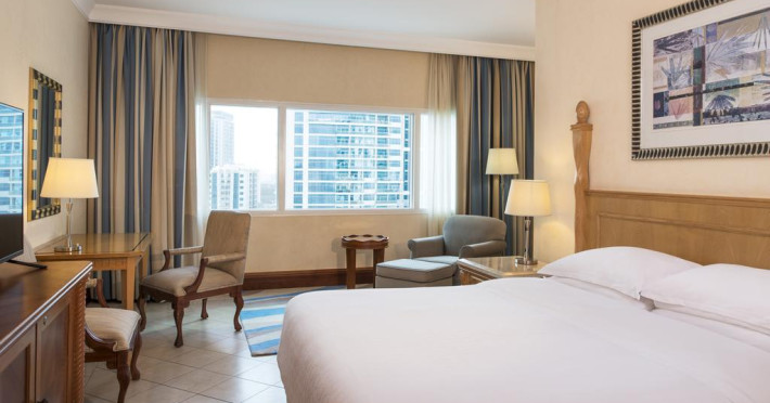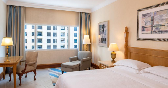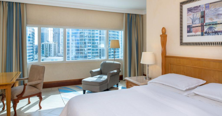 Camerele confortabile de la Sheraton Jumeirah Beach Resort au pardoseală de gresie/ marmură, aer condiționat, Tv cu canale prin satelit și seif. Oaspeții au la dispoziție serviciul de room service pentru a servi masa sau diverse băuturi. În camere există baie cu cadă sau duș ce are în dotare foehn și articole de toaletă gratuite. Unele camere au vedere la mare. Oaspeții au acces gratuit la serviciul Wi-fi în camere. Curățenia in cameră se face zilnic. Proprietatea oferă camere pentru familie cu o suprafață mai mare și un număr mai mare de paturi față de cele standard. Se pot rezerva de asemenea camere pentru nefumători.