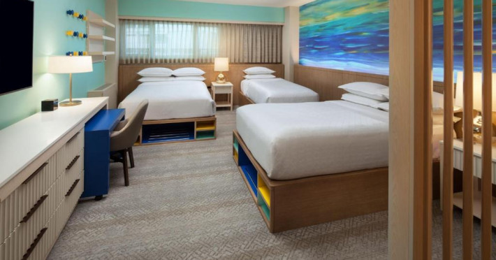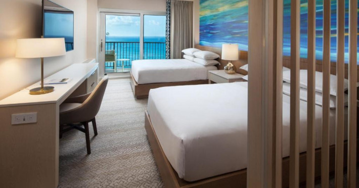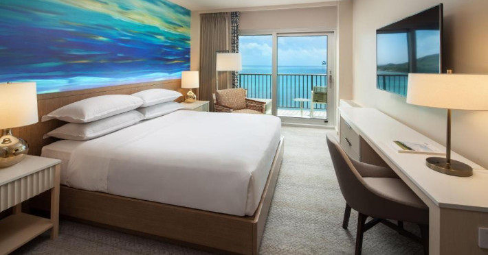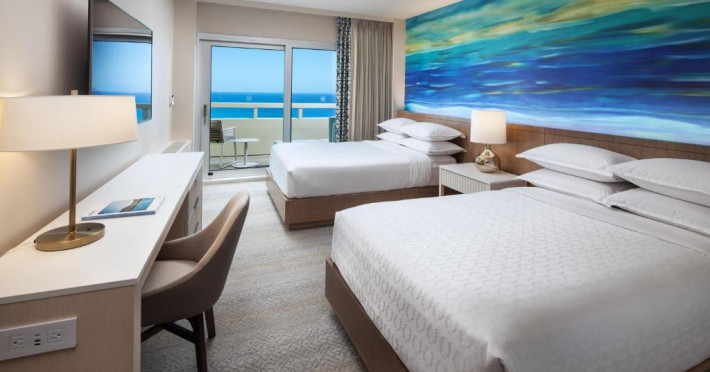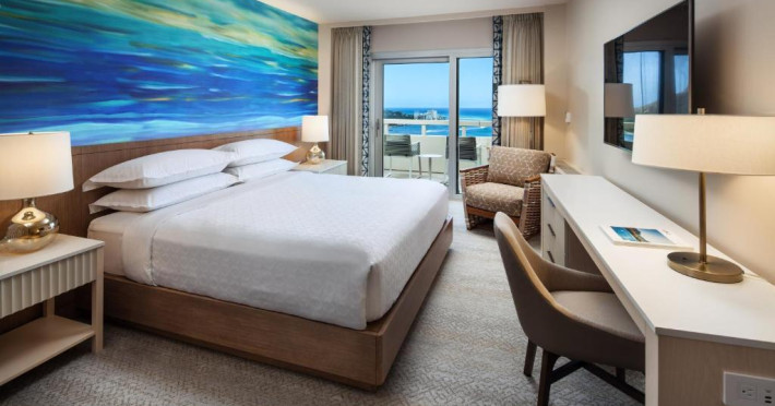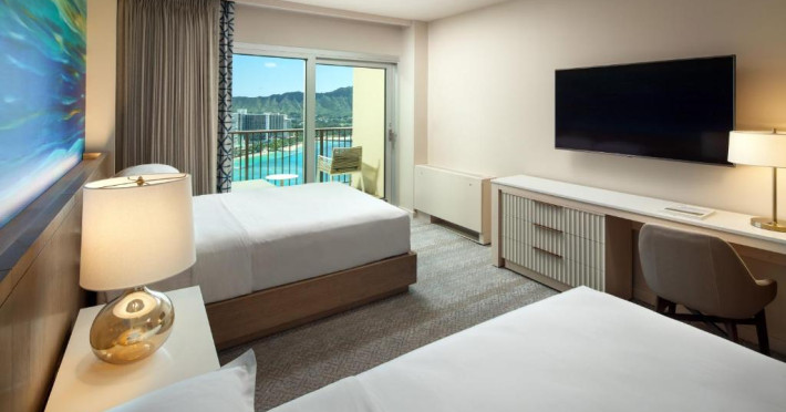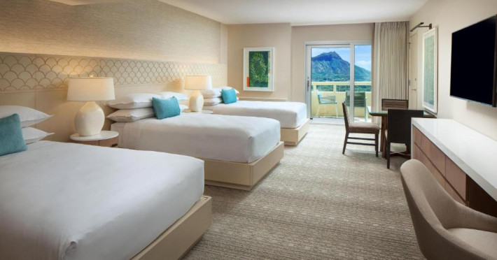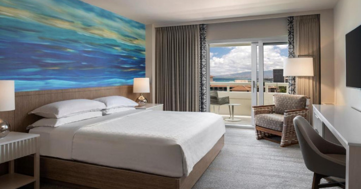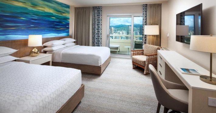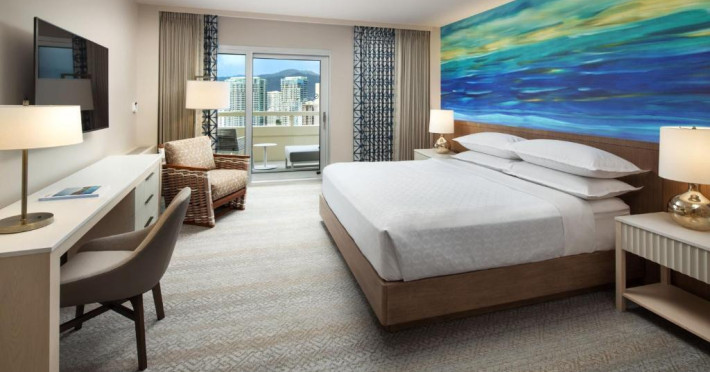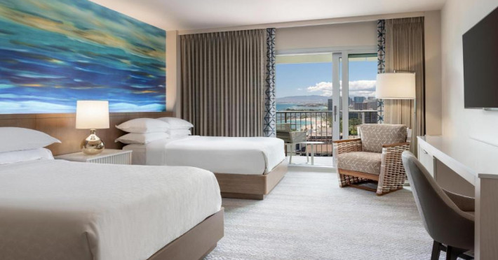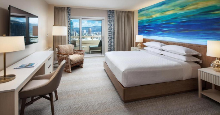 Camerele moderne de la Sheraton Waikiki Beach Resort au TV cu ecran plat și jocuri video. Camerele sunt decorate simplu și oferă un balcon privat, unele cu vedere la munte sau la ocean. De asemenea, sunt oferite cafea in cameră și un birou.