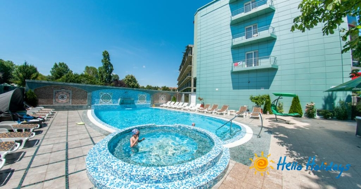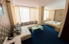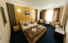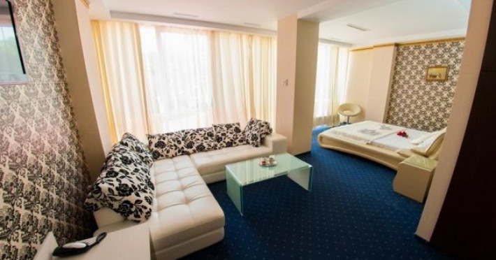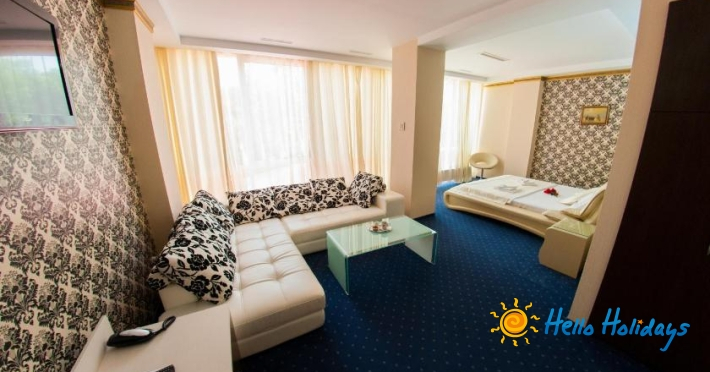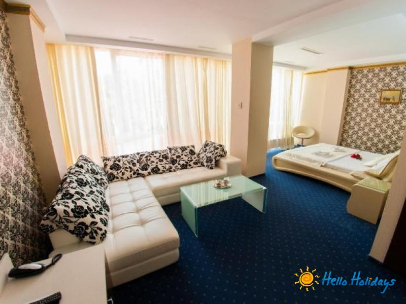 Suita Junior are suprafata de 32mp, aer conditionat, minibar, perete cortina spre promenada la strada Trandafirilor - strada principala in Statiunea Neptun. Patul matrimonial este tapitat cu piele naturala si are dimensiunile saltelei de 180x200cm. Peretii sunt tapetati in totalitate cu tapet modern. Baia moderna si spatioasa are in dotare cabina dus 120x120cm, cu hidromasaj, aparat radio, mobilier din lemn de stejar.