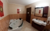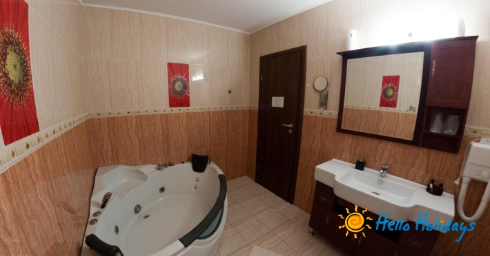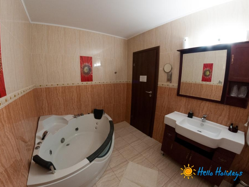 Suita are suprafata de 32mp, aer conditionat, minibar, perete cortina spre promenada la strada Trandafirilor - strada principala in Statiunea Neptun. Patul matrimonial este tapitat cu piele naturala si are dimensiunile saltelei de 180x200cm. Peretii sunt tapetati in totalitate cu tapet modern. Baia moderna si spatioasa are in dotare jacuzzi si mobilier din lemn de stejar.