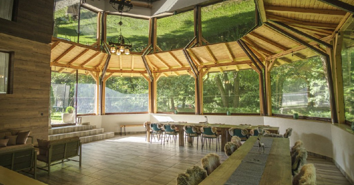Restaurantul este construit la distanta de corpul de cazare si cel de bucatarie, asigurandu-se astfel confort celor cazati, dand de asemenea posibilitatea celor veniti sa se distreze sa o faca, fara grija ca ar putea deranja. In incinta restaurantului se afla un bar cu bauturi romanesti si internationale.
