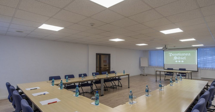 Sala de conferinta are o suprafata de 120 mp, o capacitate de 50 persoane, nu are stalpi care sa obtureze vizibilitatea si este iluminata natural, prin cele patru geamuri amplasate cate doua, in fata si in spate. Este echipata cu 2 flipchart-uri cu consumabilele incluse, proiector HD Canon cu conexiune wireless, la care se pot conecta pana la patru calculatoare, ecran de proiectie retractabil automat, cu telecomanda, de dimensiuni mari.