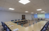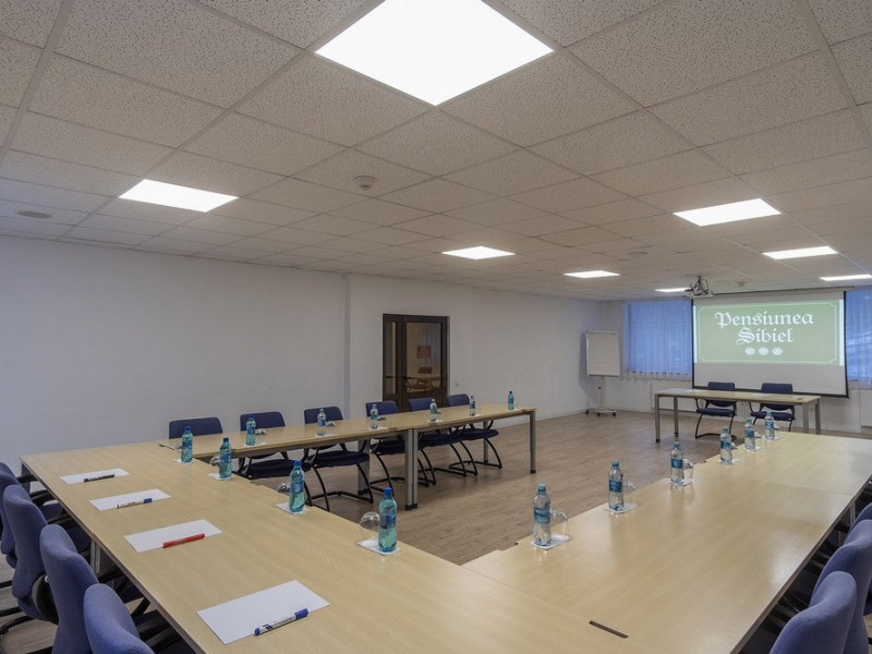 Sala de conferinta are o suprafata de 120 mp, o capacitate de 50 persoane, nu are stalpi care sa obtureze vizibilitatea si este iluminata natural, prin cele patru geamuri amplasate cate doua, in fata si in spate. Este echipata cu 2 flipchart-uri cu consumabilele incluse, proiector HD Canon cu conexiune wireless, la care se pot conecta pana la patru calculatoare, ecran de proiectie retractabil automat, cu telecomanda, de dimensiuni mari.