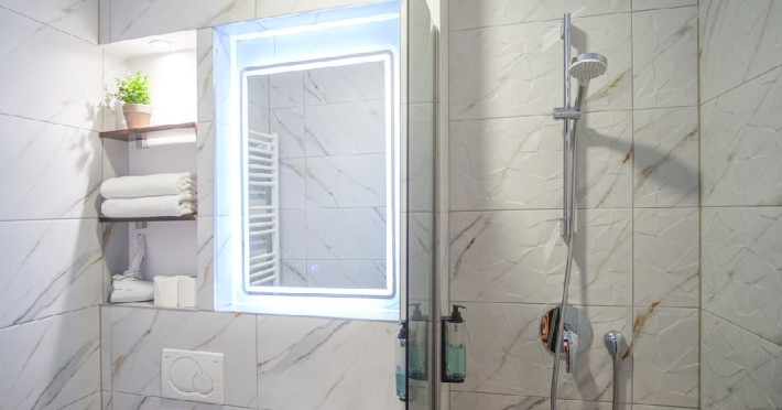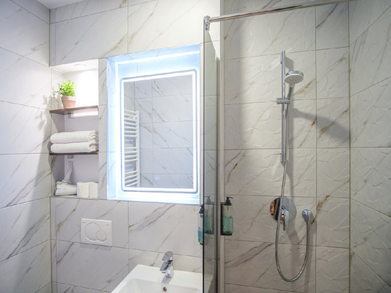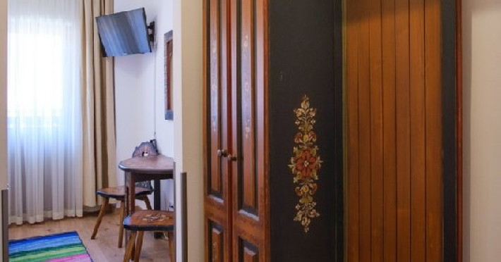 Apartamentele au o suprafata de 30 mp, fiecare are iesire la balcon, cu vedere la padure. Apartamentul are un dormitor cu suprafata de 12 mp cu un pat matrimonial si o camera de 18 mp, in care se gasesc doua paturi twin, un dulap, un birou, o masuta si doua scaune, televizor cu ecran plat