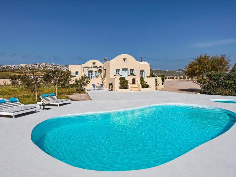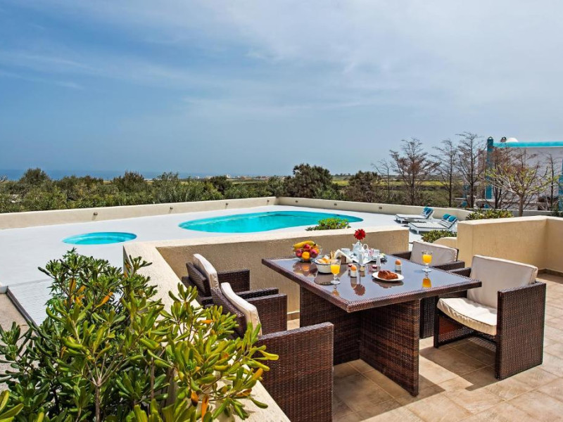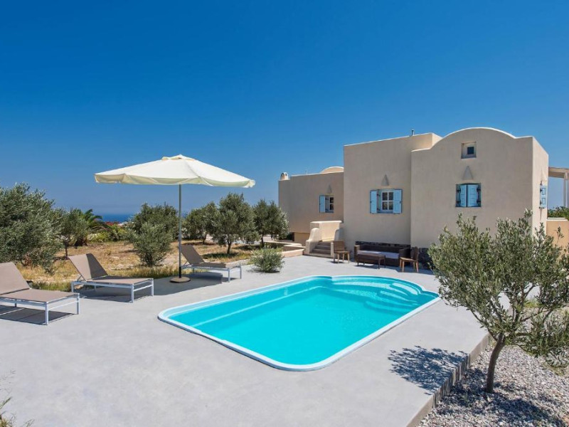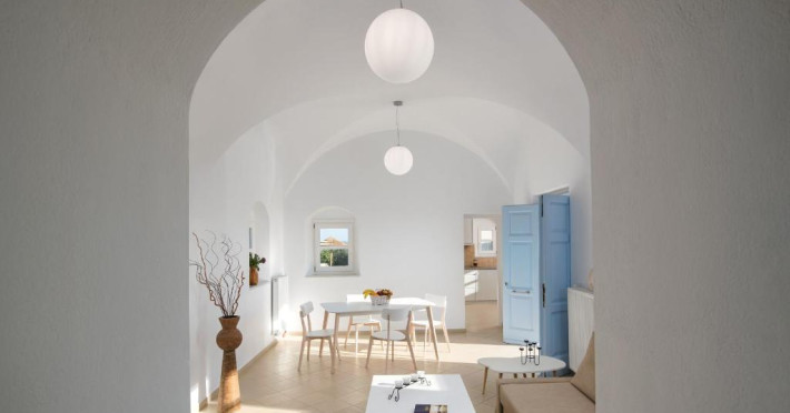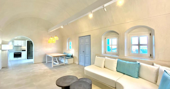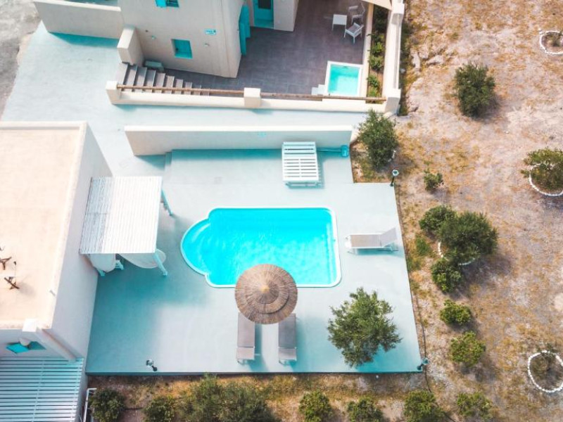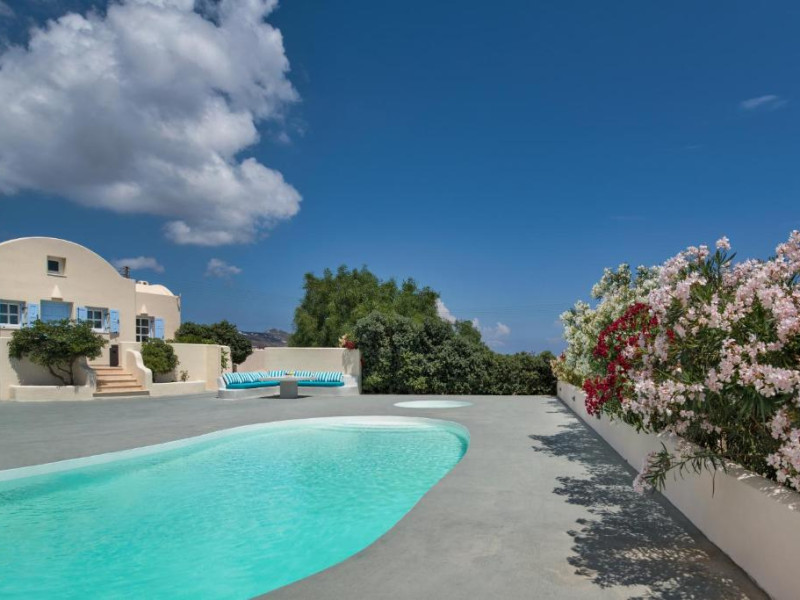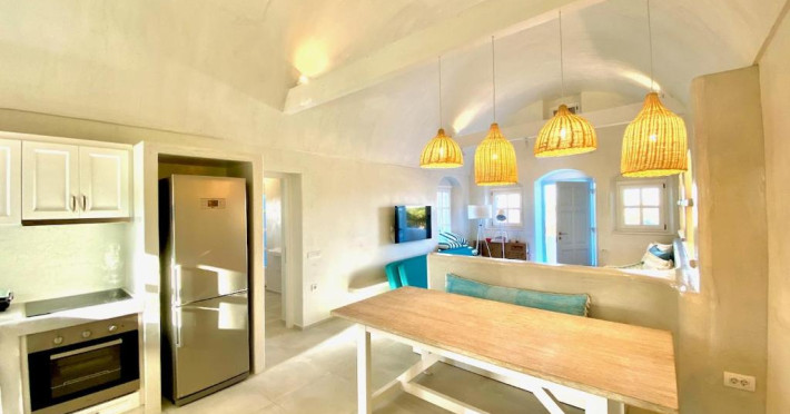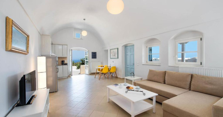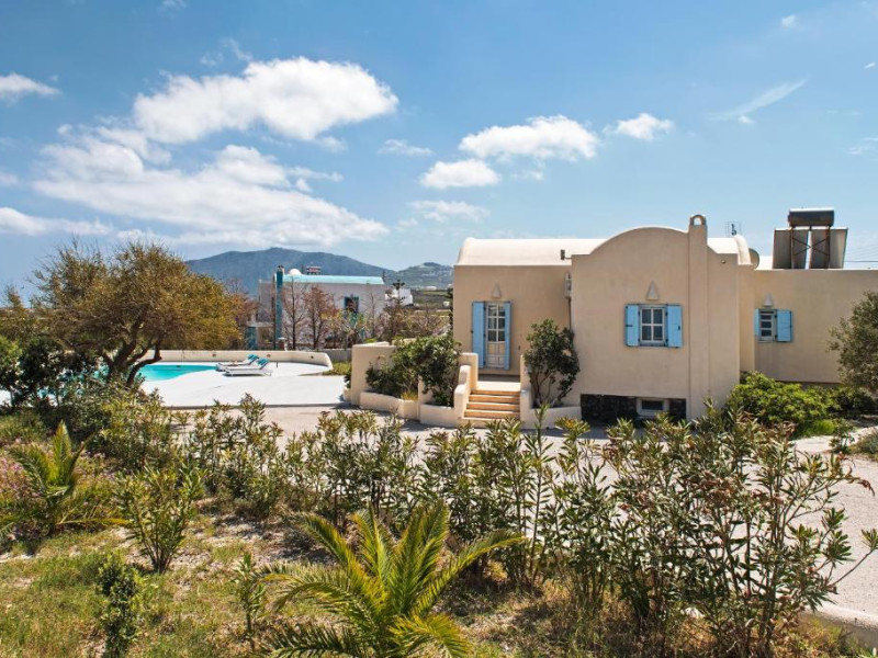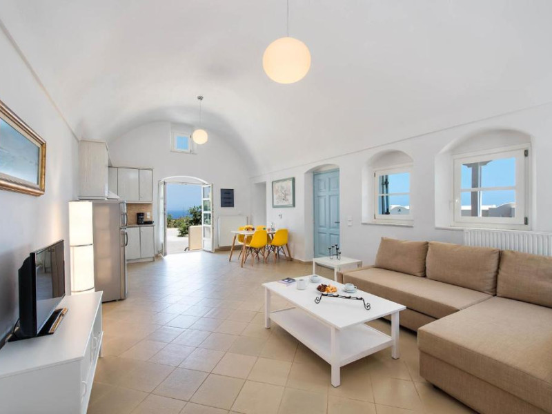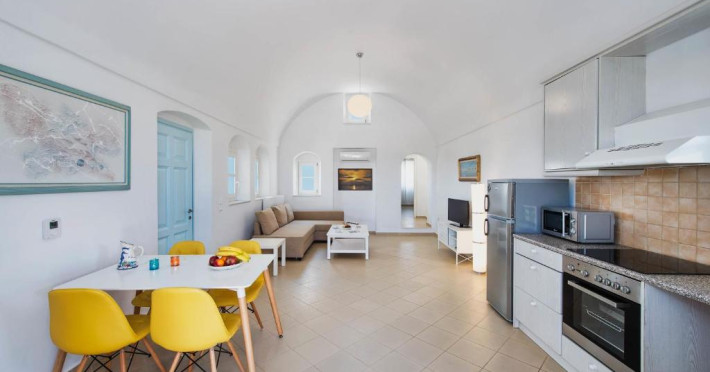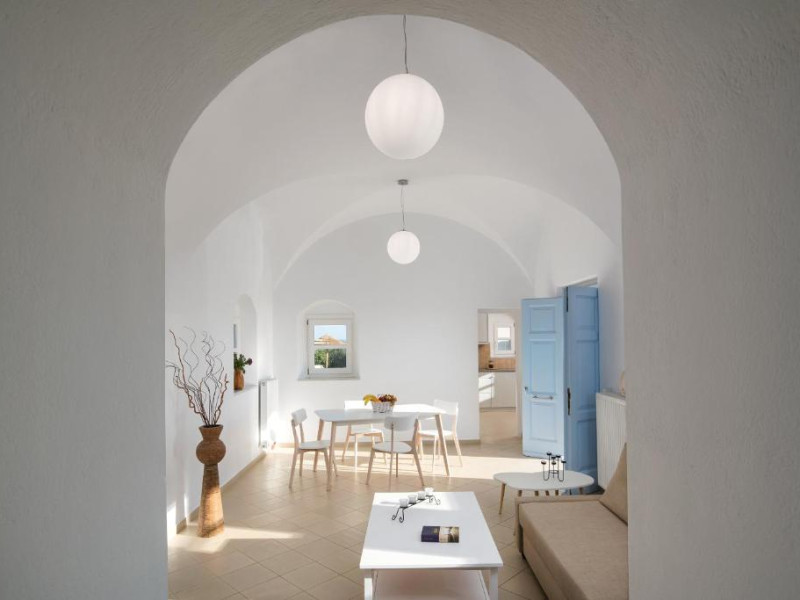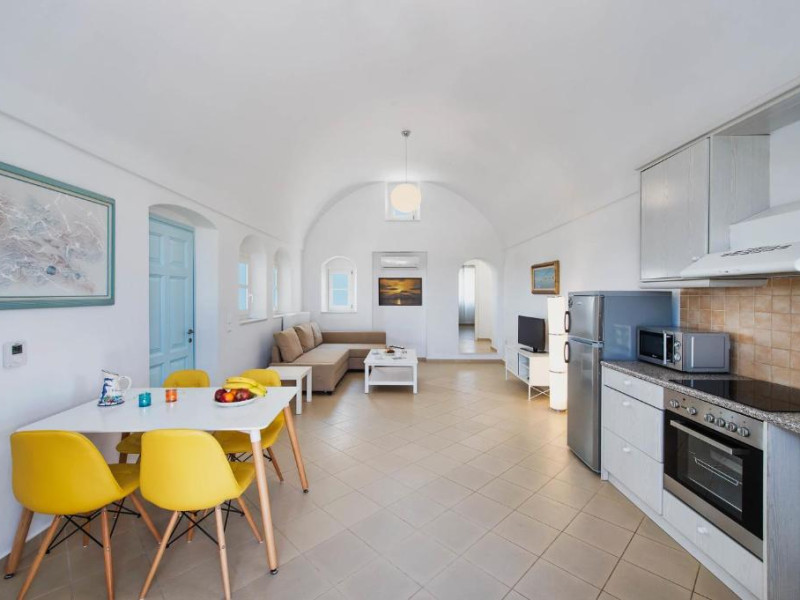 Restaurantele și barurile se află la 1,5 km de proprietate, iar la cerere și la un cost suplimentar pot fi livrate produse alimentare. Plaja Exo Gialos este situată la 1,5 km. Orașul animat Fira se află la 3 km, iar Aeroportul Santorini este situat la 10 km.
