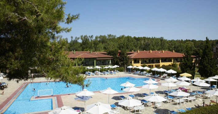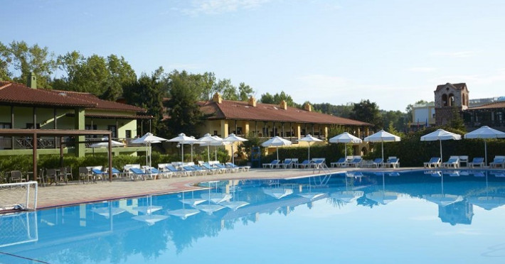 Hotelul Simantro ofera o larga varietate de facilitati pentru familii, cupluri, dar si pentru cei singuri. Doua piscine cu apa proaspata, plaja si baruri de piscine, taverna langa plaja, terenuri de tenis si distractie pentru toti. Gradinile bogate si stilul traditional al acestui hotel il fac unic pentru o sedere relaxanta si placuta. El ofera 325 de camere nou renovate, spatioase si elegant decorate cu vedere spre munte sau gradina.Descriere