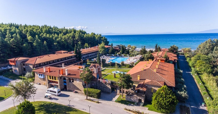 Înconjurat de păduri de pin şi flori, Simantro Resort Hotel se bucură de o poziţie privilegiată pe plaja din Kassandra, în Chalkidiki.