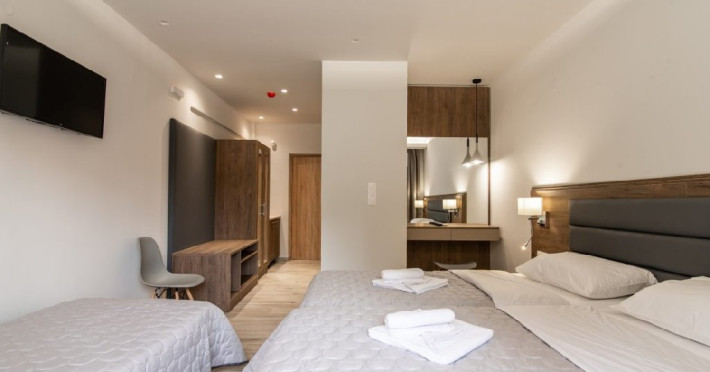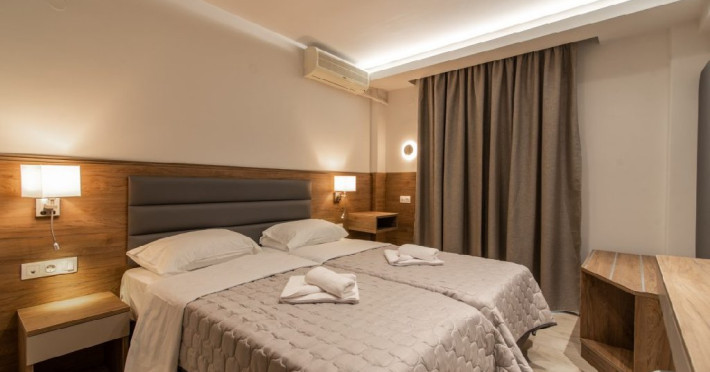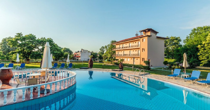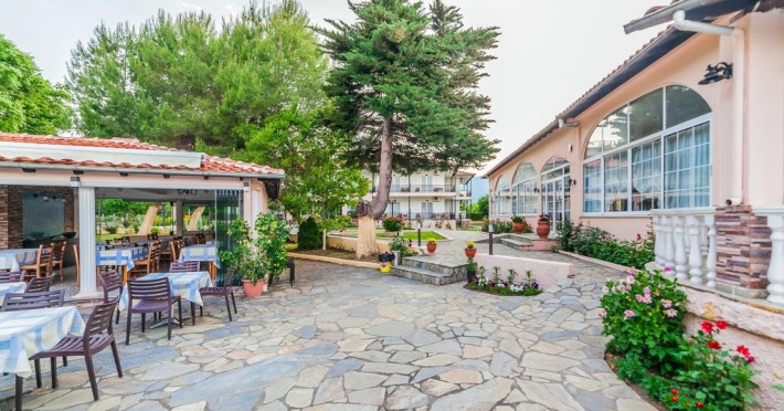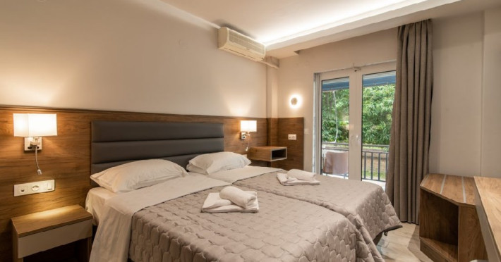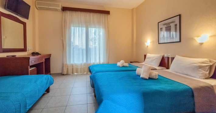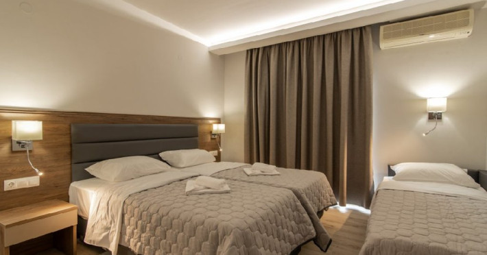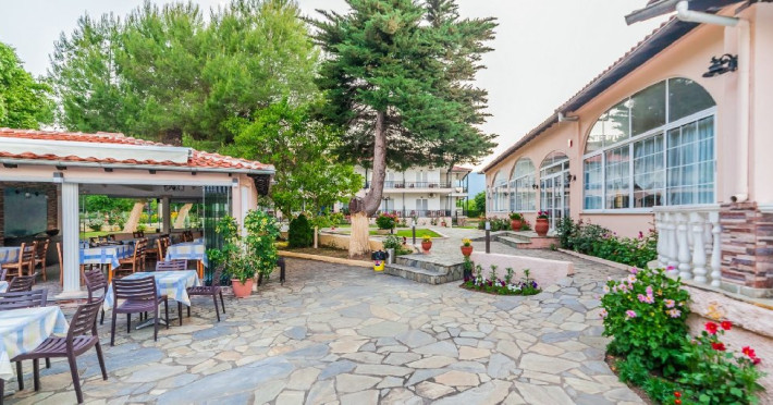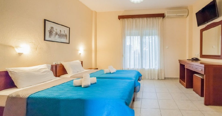 Localizare: Hotelul Sintrivani este situat intr-o zona linistita, departe de zgomotul cotitian, in statiunea Paralia Skotina. Zona in care se afla hotelul este foarte frumoasa, plina de verdeata, iar pentru a ajunge la plaja se traverseaza o padure de platani seculari (exista drum asfaltat).Facilitati camere: Complexul este format din cladirea principala - Hotel cu 28 de camere; beneficiaza de aer conditionat, frigider, uscator de par,TV, grup sanitar cu dus, internet WiFi gratuit.