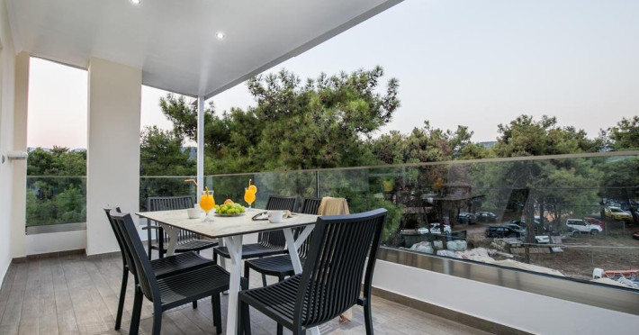 In apartament se pot caza 2-5 persoane. Apartamentul are 50 de metri patrati si este format din 2 camere (dormitor - pat matrimonial + living cu canapea extensibila), chicineta, grup sanitar propriu si terasa cu vedere la piscina.