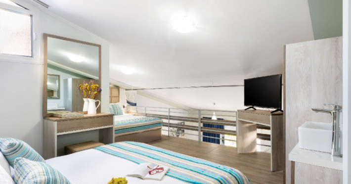 In Grand Suite (6 adulti + 2 copii) 2 dormitoare + living cu canapea extensibila.