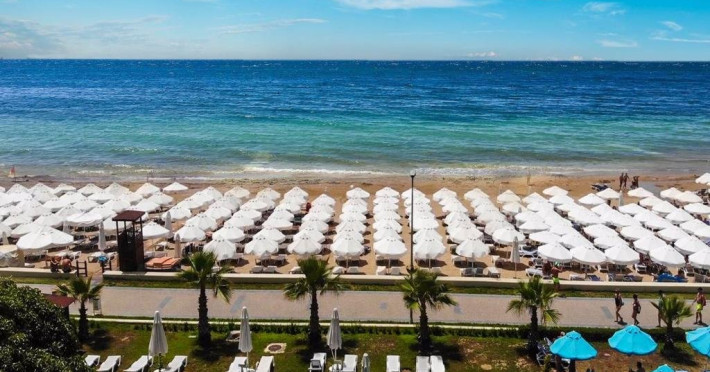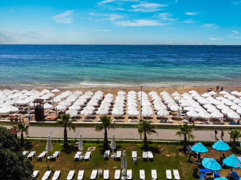 Plaja: zona de plaja privata cu nisip, sezlonguri, umbrele si saltele gratuite