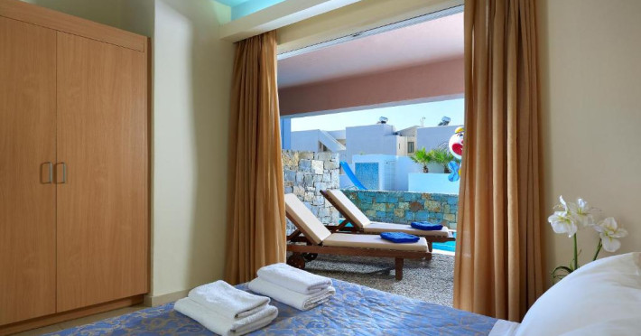 Sunt disponibile 150 camere. Camerele au balcon cu masă și scaune unde pot fi petrecute momente de relaxare. În camere există baie cu cadă sau duș ce are în dotare foehn și articole de toaletă gratuite. Camerele confortabile de la Sissi Bay Hotel au pardoseală de gresie/ marmură, aer condiționat, Tv cu canale prin satelit și seif. Fiecare cameră dispune de cană-fierbător. Oaspeții au acces gratuit la serviciul Wi-fi în camere. Curățenia in cameră se face zilnic. Fiecare unitate de cazare are frigider.