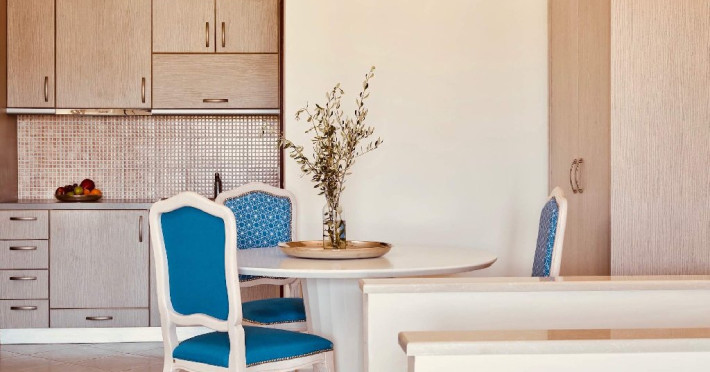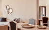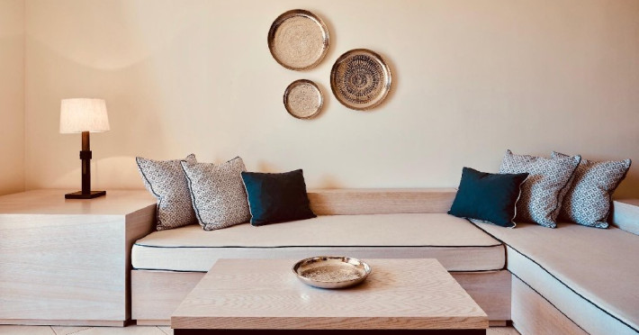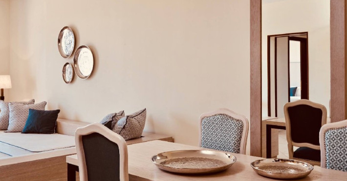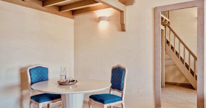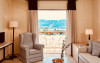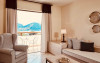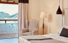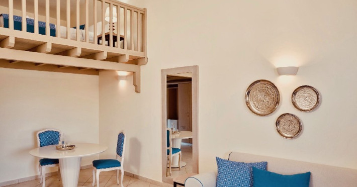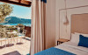 DELUXE SUITE SEA VIEW - Camera cu pat dublu, baie cu cabina de dus din sticla, bucatarie, zona de relaxare cu canapea, balcon privat cu vedere la mare. Una dintre camerele Deluxe este maisonette.