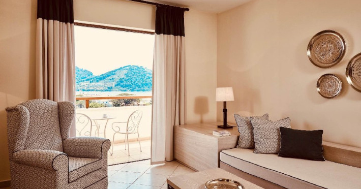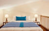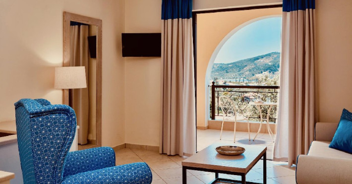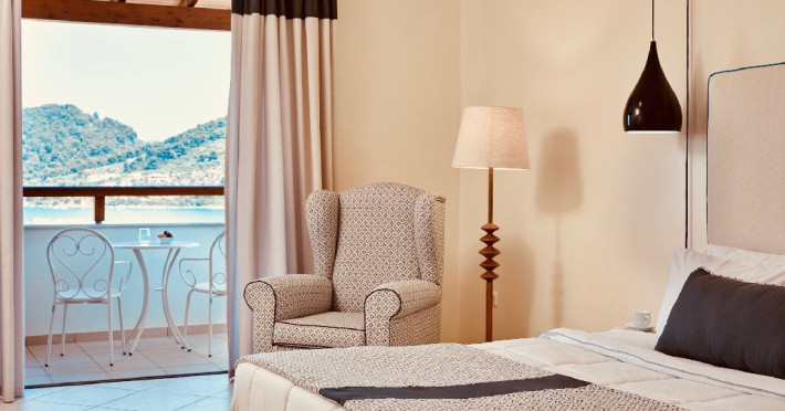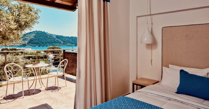 THREE BEDROOM SKIATHOS LIVING SEA VIEW - Aceasta duplexeta este compusa din doua dormitoare cu pat dublu si balcon sau fereastra privata cu vedere la mare si un dormitor cu paturi twin. Aceasta camera ofera, de asemenea, doua bai cu dus, bucatarie si zona de relaxare cu canapea.