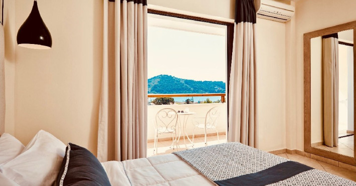 PREMIUM DOUBLE ROOM SEA VIEW - Dormitor cu pat dublu, baie cu cabina de dus din sticla, bucatarie, balcon privat cu vedere la mare si toate facilitatile moderne si confortul de care puteti avea nevoie.