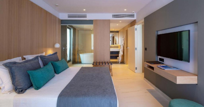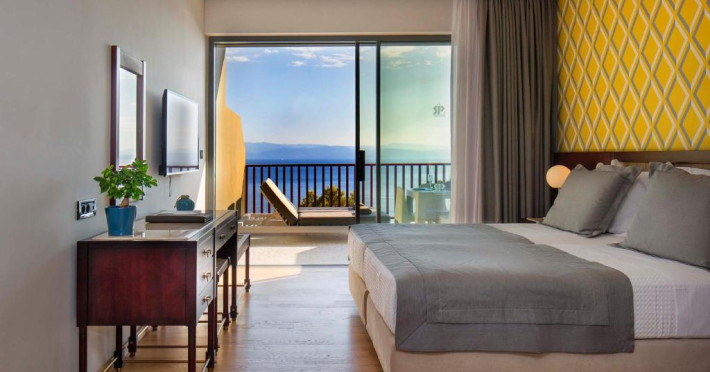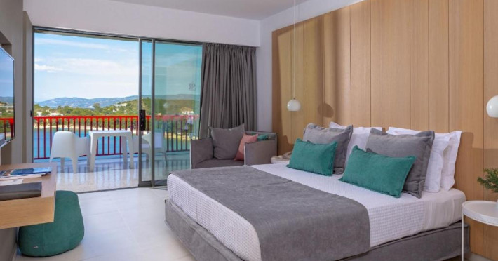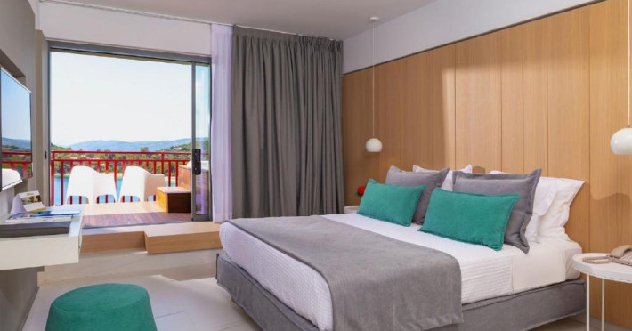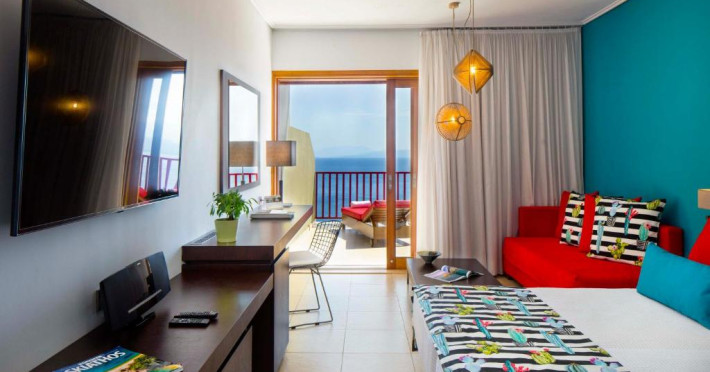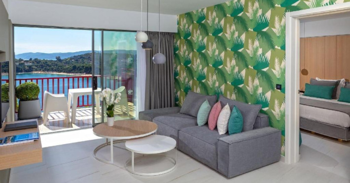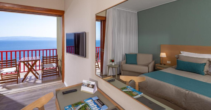 Camerele și suitele de la Skiathos Palace sunt dotate cu aer condiționat și sunt decorate cu gust. Fiecare este dotată cu TV prin satelit, minibar și articole de toaletă gratuite. Toate unitățile se deschid spre un balcon mobilat.
