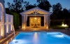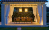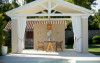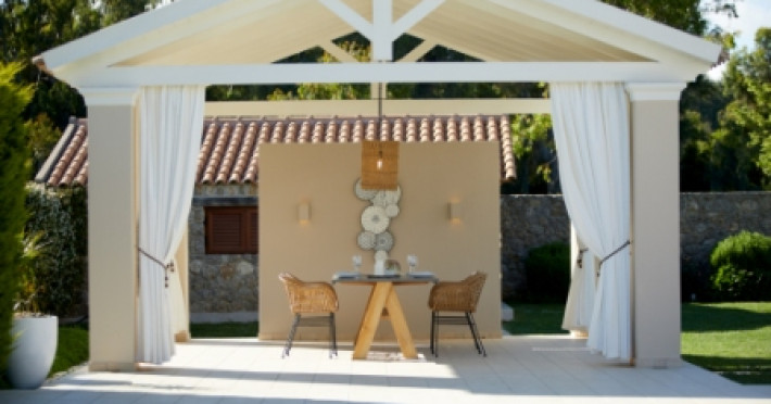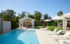 are sun beds and umbrellas, as well as a gazebo with outdoor sitting for 6, an