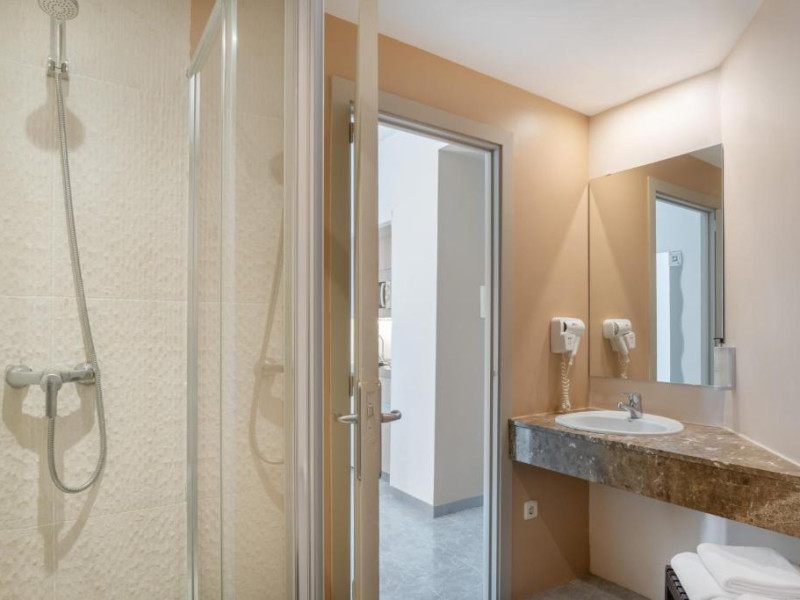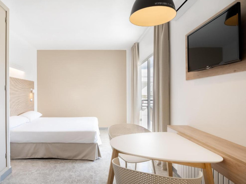 Facilitati studio: paturi twin, aer conditionat, TV satelit, baie proprie (cu uscator par, prosoape si consumabile), telefon, chicineta (cu mini-frigider, cuptor microunde, plita, cana fierbator, prajitor paine, loc de luat masa), balcon/ terasa. Unele camere au vedere la piscina sau partial la mare (contra cost).