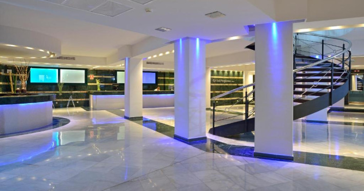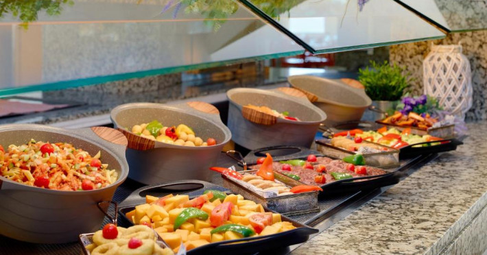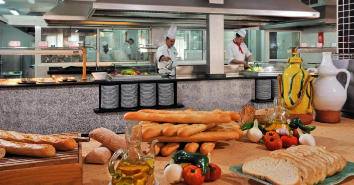 Cele 2 restaurante tip bufet ale hotelului Pingüinos servesc o selecție de preparat internațional, inclusiv spaniole, italiene și orientale. De asemenea, există o cafenea și un snack bar cu autoservire, amenajat cu o terasă langă zonă.