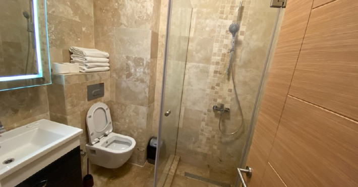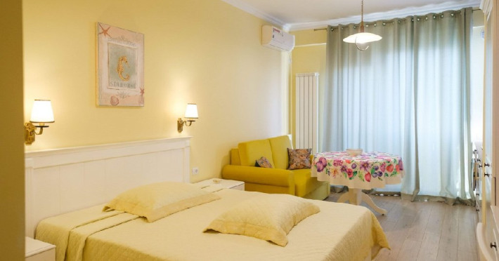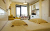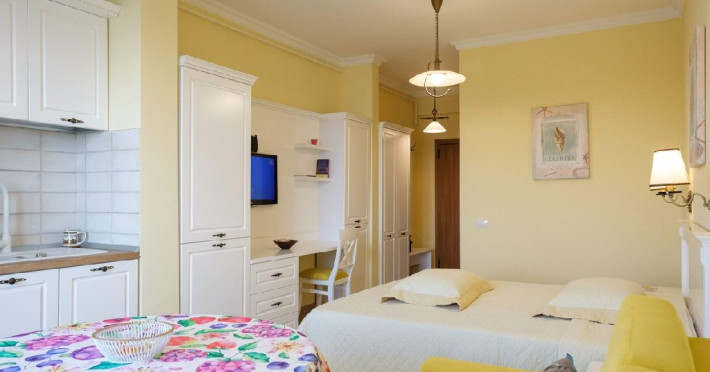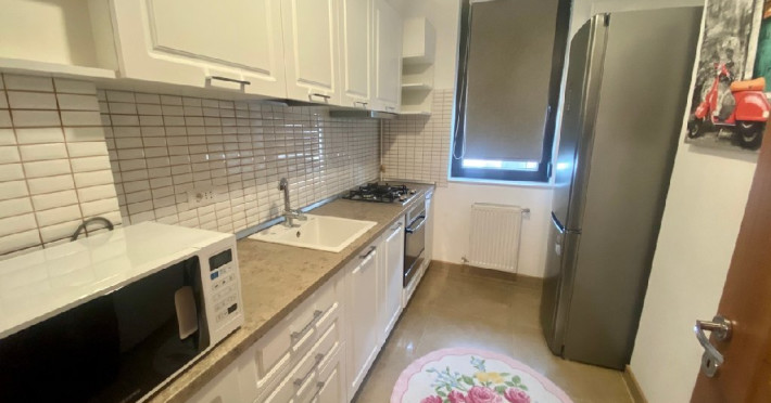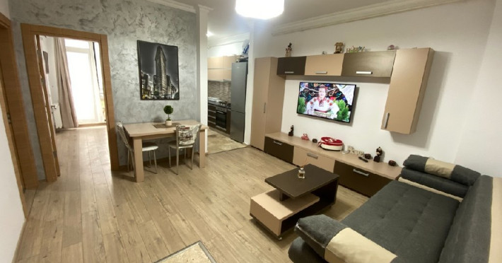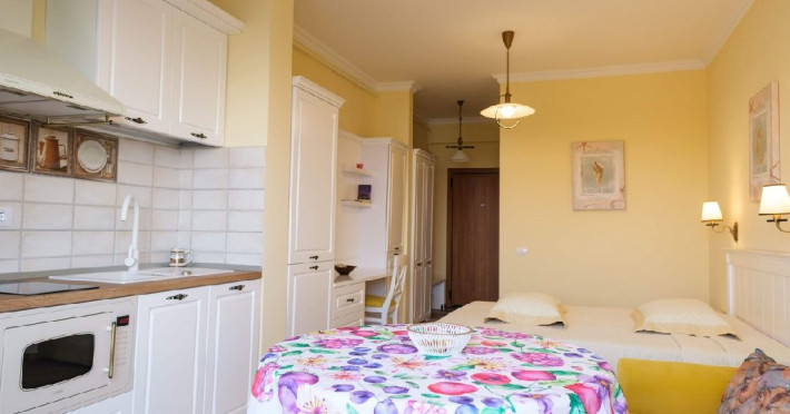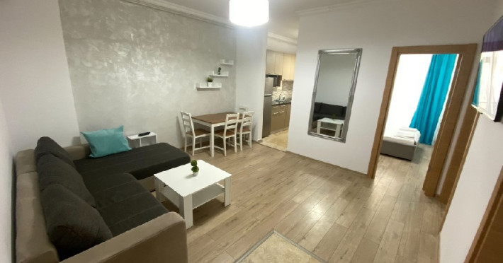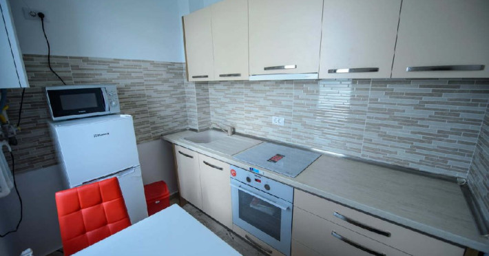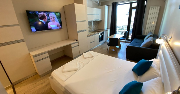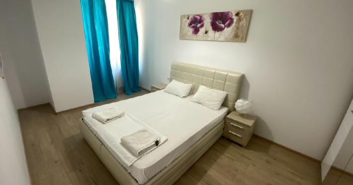 Are 1 camera cu pat matrimonial plus canapea extensibila, bucatarie complet mobilata si utilata, baie dotata cu cabina de dus. Garsoniera poate acomoda 4 adulti sau 2 adulti plus 2 copii.