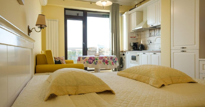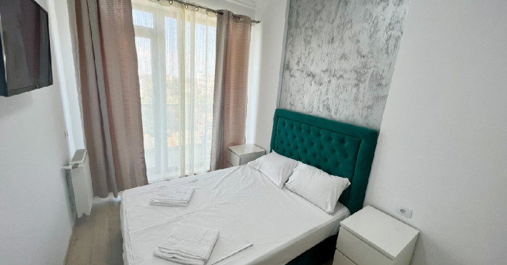 Are 1 camera cu pat matrimonial plus canapea extensibila, bucatarie complet mobilata si utilata, baie dotata cu cabina de dus. Garsoniera poate acomoda 4 adulti sau 2 adulti plus 2 copii.