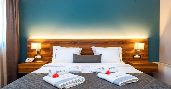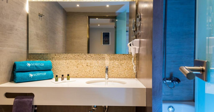 Sunt disponibile 106 camere. În camere există baie cu cadă sau duș prevăzută cu foehn. Oaspeții au la dispoziție serviciul de room service pentru a servi masa sau diverse băuturi. Camerele luminoase de la Solimar Aquamarine sunt dotate cu aer condiționat și Tv cu canale prin satelit. Oaspeții au acces gratuit la serviciul Wi-fi în camere. Curățenia in cameră se face zilnic. Proprietatea oferă camere pentru familie cu o suprafață mai mare și un număr mai mare de paturi față de cele standard.