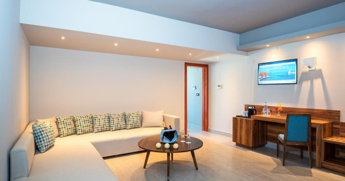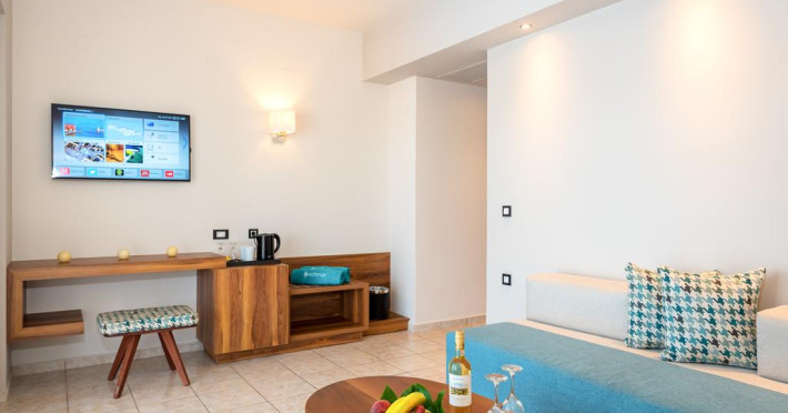 Solimar Aquamarine este o proprietate de 5 stele care se află pe malul mării, în Gerani (Creta-Chania), și oferă piscină în aer liber cu șezlonguri și umbrele de soare, precum și centru spa/wellness care asigură servicii pentru un sejur extrem de relaxant. Facilitățile de la Solimar Aquamarine includ sală de fitness și teren de tenis. Pentru petrecerea timpului liber oaspeții au la dispoziție activități de agrement pe timpul zilei și programe de divertisment seara. Proprietatea are, de asemenea, servicii de recepție cu program non - stop și închirieri auto. Se oferă acces gratuit la internet Wi-fi în spațiile publice. Parcarea este disponibilă la proprietate gratuit.