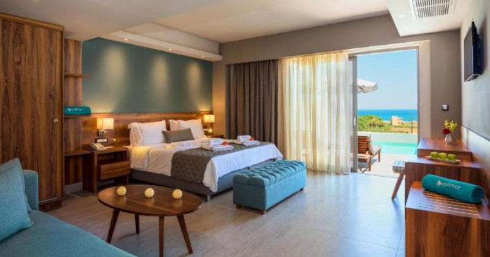 Hotelul se remarcă prin cele 104 camere pe care le oferă, iar atmosfera sa distinctivă este conturată de o armonie perfectă între mediul natural înconjurător cu vedere la mare și facilitățile sale impecabile. Fiecare cameră și apartament spațios emană confort și eleganță, contribuind la crearea unei experiențe de cazare cu adevărat memorabile. Cu un serviciu atent și dedicat, oaspeții se pot bucura de o atmosferă liniștită și plăcută, unde intimitatea și relaxarea sunt prioritare. Bucătăria rafinată, cu influențe locale și mediteraneene, adaugă o notă de delicii culinare la șederea lor. Această combinație grijulie de elemente transformă vacanța într-un moment special, perfect adaptat pentru cupluri de toate vârstele sau familii în căutare de o escapadă privată și relaxantă.Descriere hotel