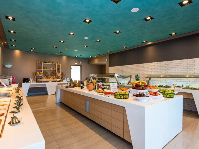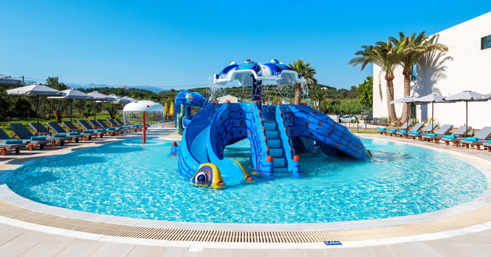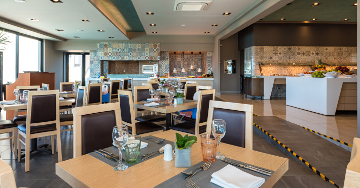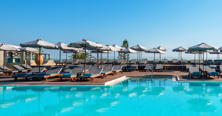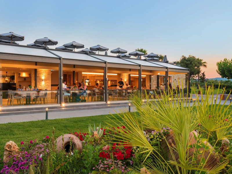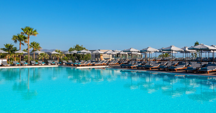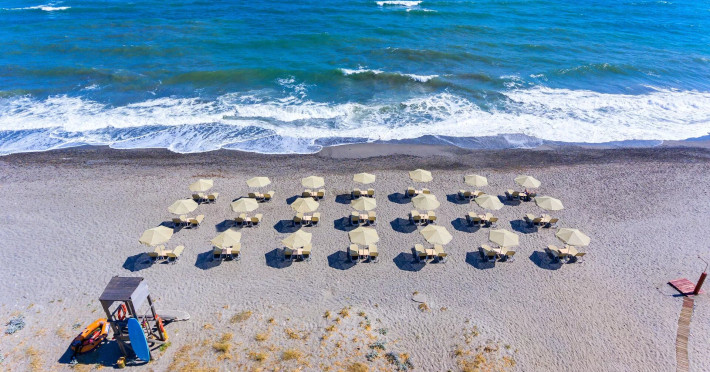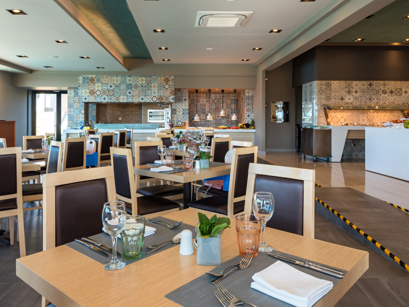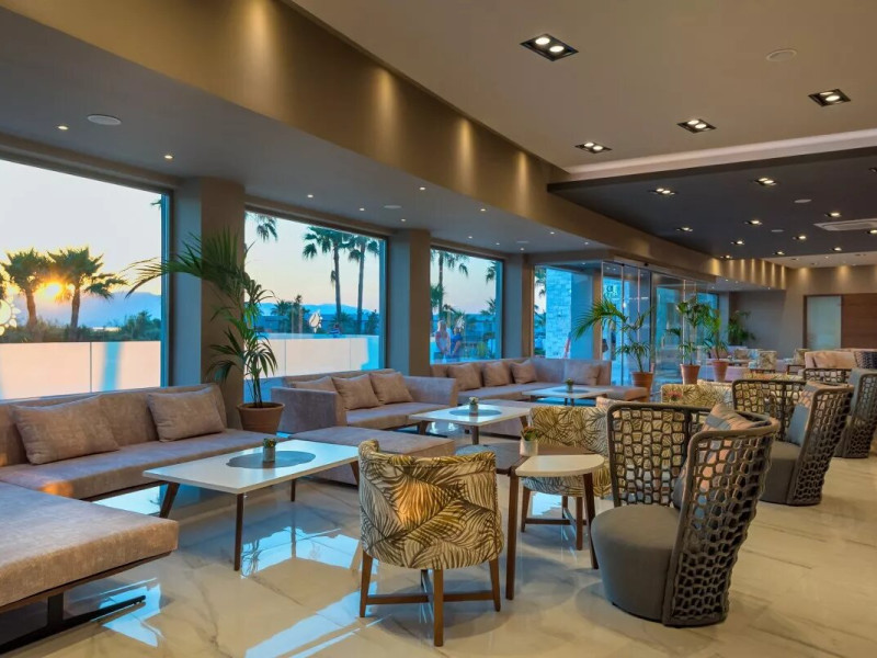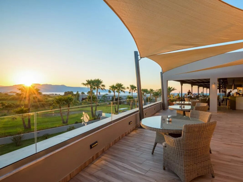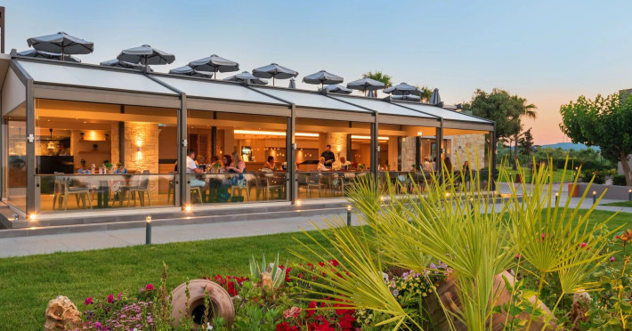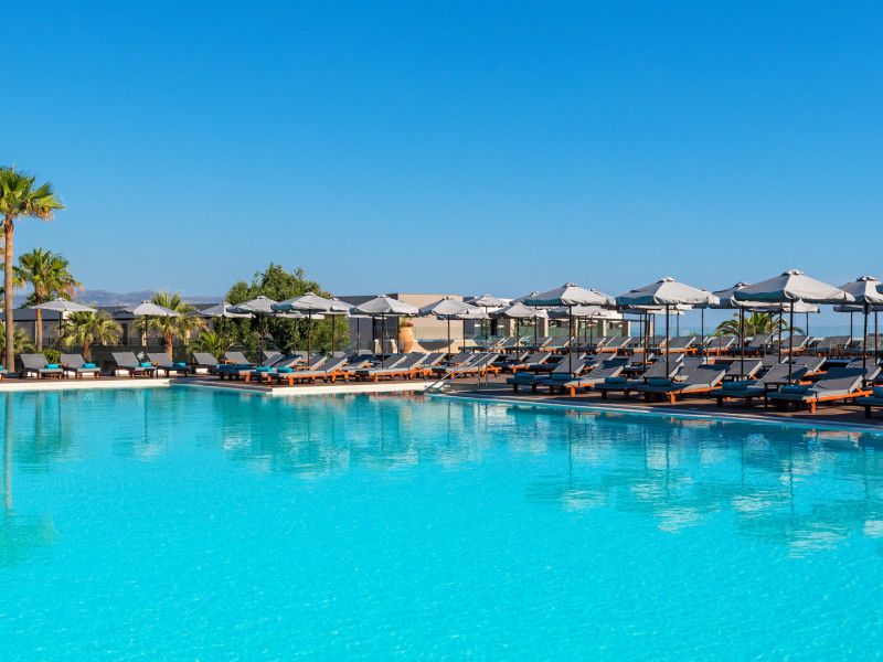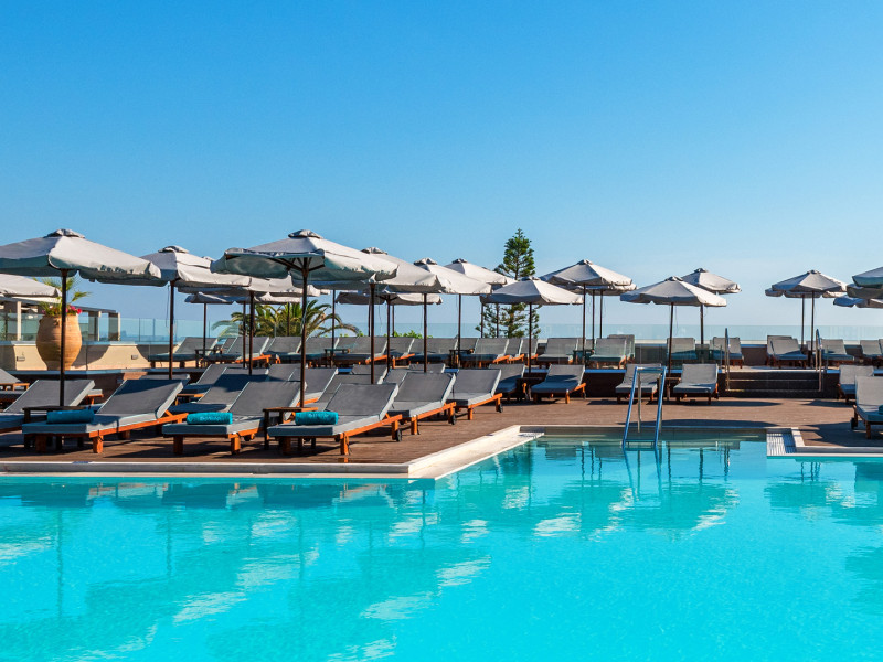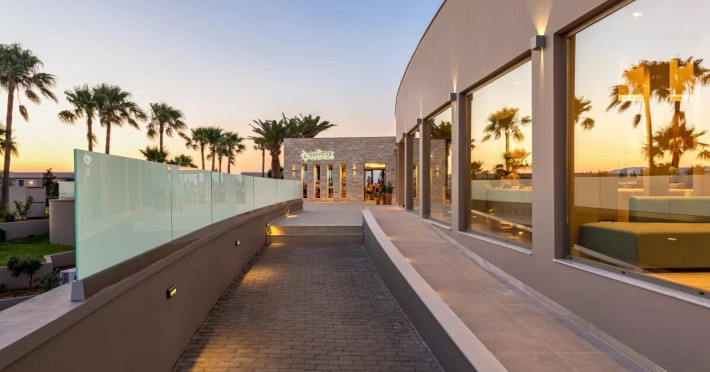The Hotel consists of 104 Rooms.The combination of the natural environment with sea views, the spacious Rooms and Suites, the attentive service, the exquisite local and Mediterranean cuisine create a peaceful, pleasant,private and relaxing ideal holidays for couples of all ages, or families.The Hotel offers a main pool, with no shallow end (1,40 x 3,00cm) is situated towards the middle of the Hotel, surrounded by gardens and palm trees, with its own pool bar, showers and changing rooms. The Deck chairs and Umbrellas by the pool area are free of charge. The guests can enjoy island food served in the luxurious surrounding of the main Restaurant with a vast buffet on show for breakfast, lunch and dinner. The best products of Crete are combined to offer a rich, high quality that will satisfy even the most demanding tastes.