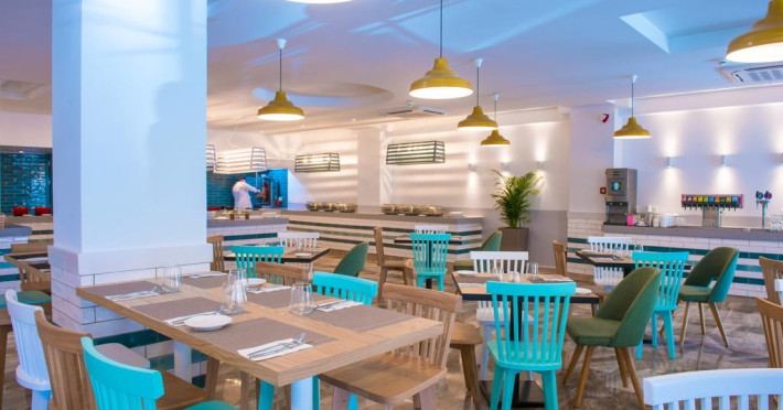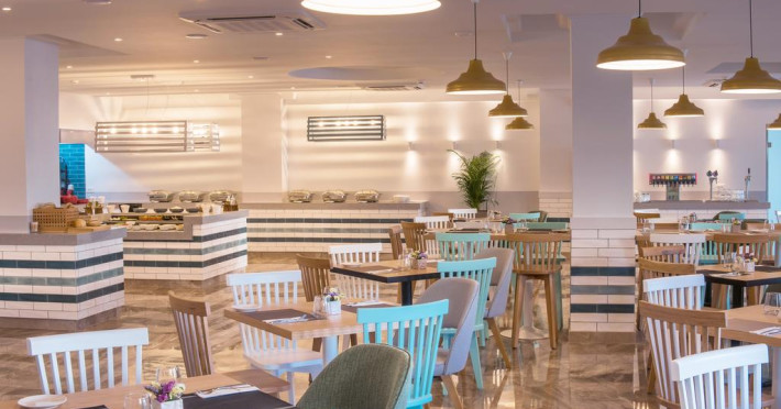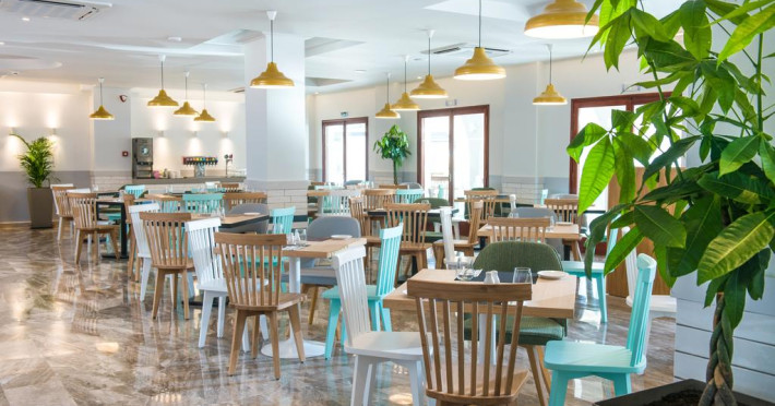 La Solimar Turquoise oaspeții au la dispoziție 2 restaurante unde pot savura mâncăruri delicioase, în stil bufet sau à la carte. Preparate din bucătăria mediteraneeană și italiană sunt preparate zilnic. Masa poate fi servită atât în interior, cît si în aer liber, pe terasă, în funcție de vreme. Oaspeţii pot avea diverse băuturi răcoritoare sau alcoolice la bar. În cadrul proprietății există și un snack bar care servește băuturi și gustări.
