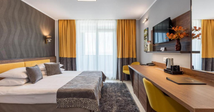 Facilități cameră dublă: pat matrimonial sau twin, baie proprie cu cadă sau duș, aer condiționat, televizor, telefon, uscător de păr, internet Wifi, minibar, seif, balcon.